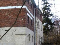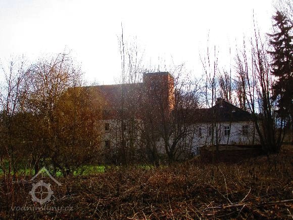 Starší obytná budova je omítnutá, mlýnice s věžovou stavbou je cihlová