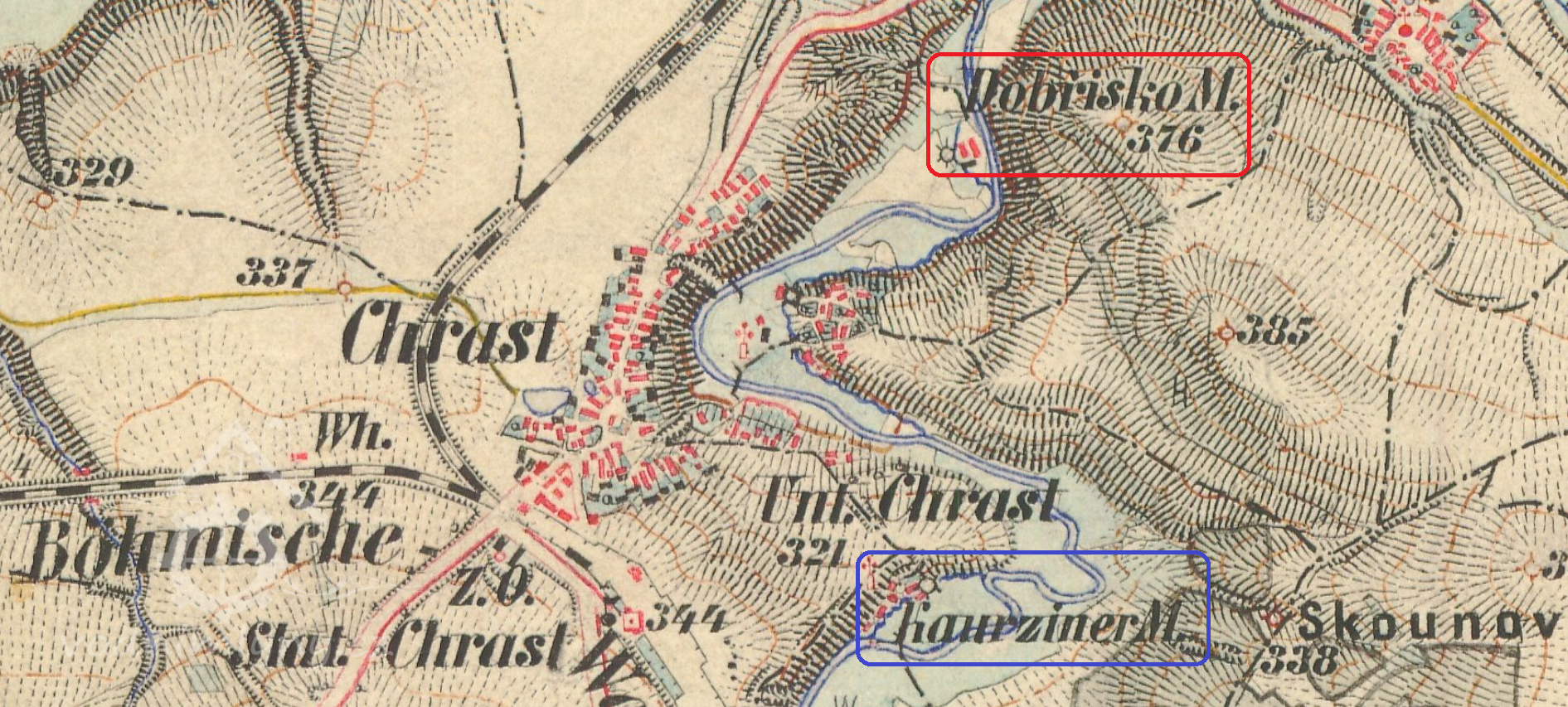 Nejstrší chrástecký mlýn, zmíněn údajně již k roku 1422. V r. 1680 mlynář Vít Kouřim byl majitelem 6 let, po něm mlynářský rod Hříchů. Vdova po mlynáři Dominiku Čechurovi se provdala v r. 1866 za mlynáře Josefa Váchu z Mlečic. V r. 1878 vydražil František Martínek tento mlýn za 12.900 zlatých.
