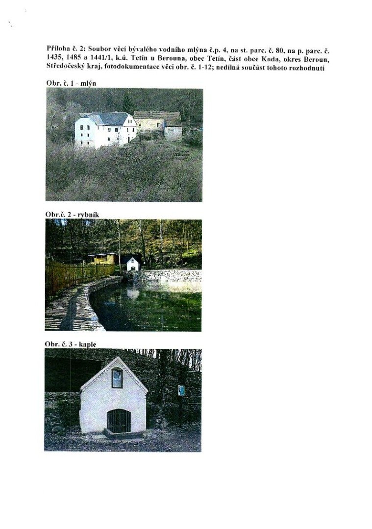 V současné podobě klasicistní mlýn č.p. 4 v Tetíně-Kodě je pravděpodobně přímým nástupcem starší stavby zpočátku 17. století. Jedná se o technicky zcela ojedinělé řešení, kdy mlýn využíval zdroj podzemní vody z jeskynního systému Českého krasu k pohonu dvou mlýnských kol na vrchní vodu. Objekt se dochoval ve své hmotě, exteriéru i interiéru, včetně původního technologického vybavení z 19 století. Integrální součástí nejbližšího okolí mlýna je mlýnská vodní nádrž a kaplička. Kaple je příkladem jednoduché sakrální stavby z konce 19. století umístěné v těsné blízkosti pramene Koda. Předmětný soubor věcí představuje významný a nezastupitelný doklad z historie mlynářství (ostatně model mlýna v Kodě byl vyhotoven již pro Národopisnou výstavu českoslovanskou, která se uskutečnila v Praze v roce 1895).