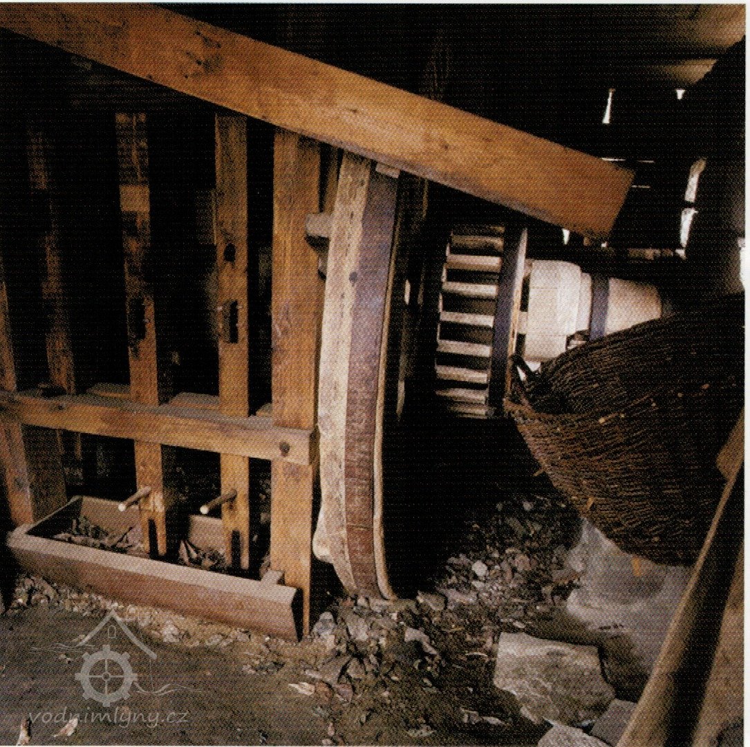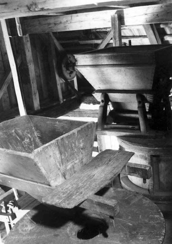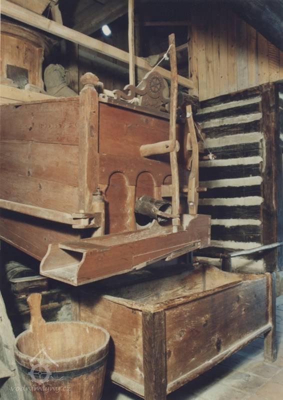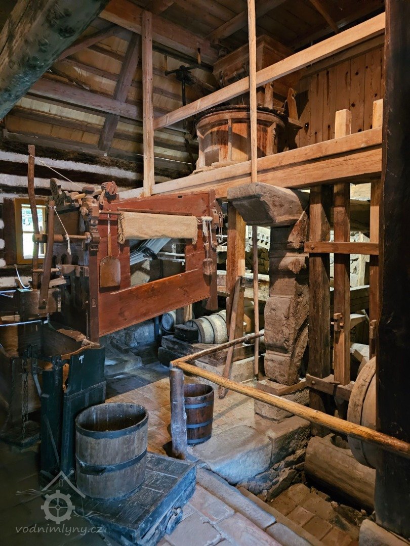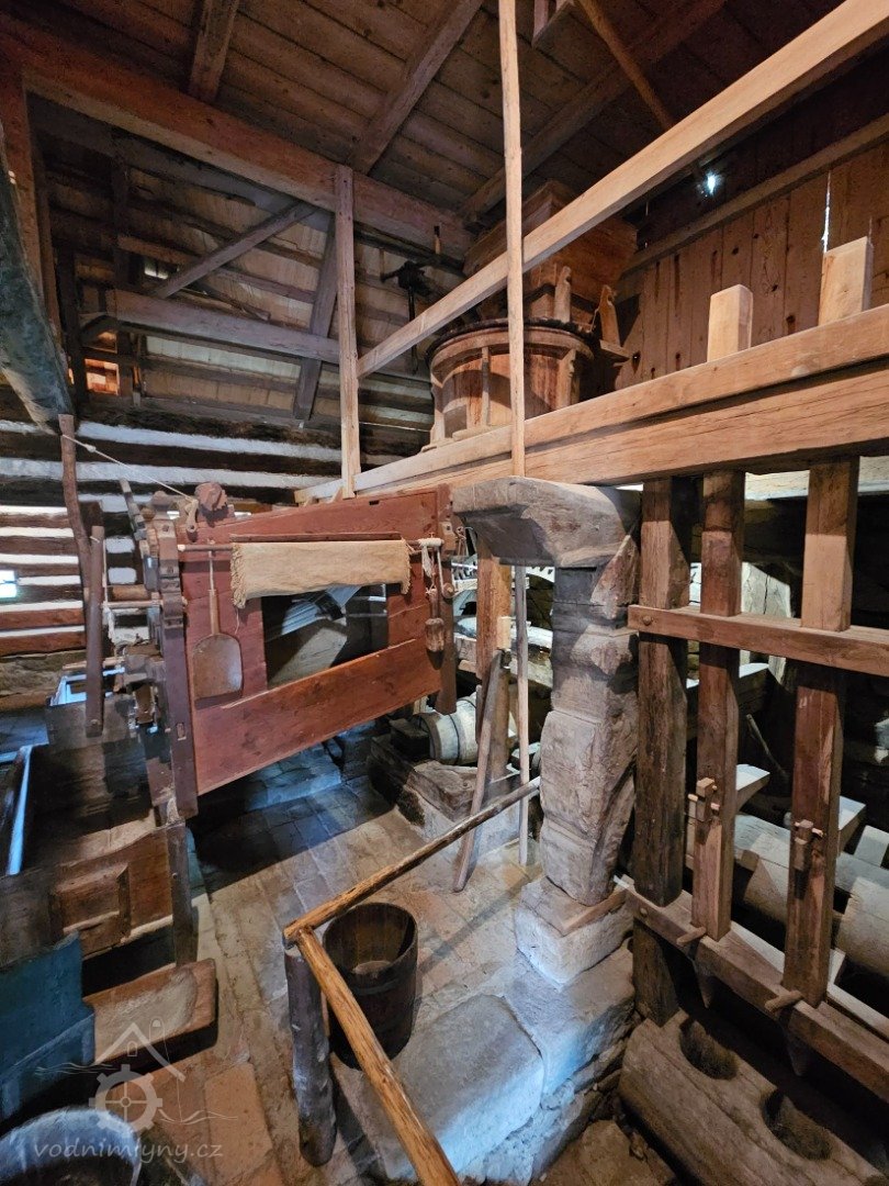 Mlýnice, 05 2024, © Milhaus, (Prvky na obrázku: kamenné složení (šrotovací, mlecí), násypný koš, moučnice, moučná truhla, žejbro)