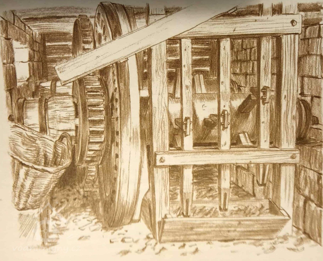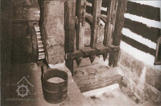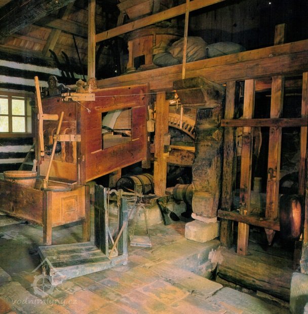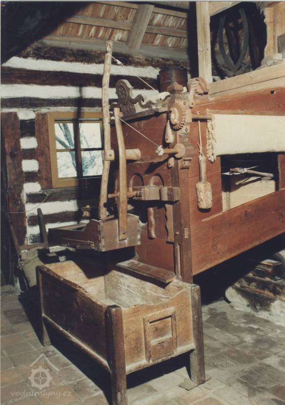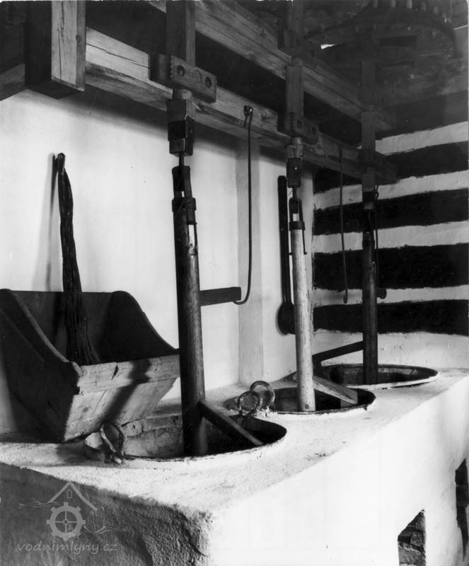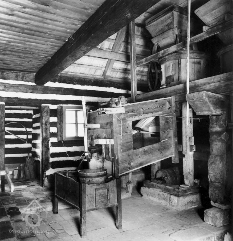 Mlýnice, 05 2024, © Milhaus, (Prvky na obrázku: kamenné složení (šrotovací, mlecí), násypný koš, moučnice, moučná truhla, žejbro)
