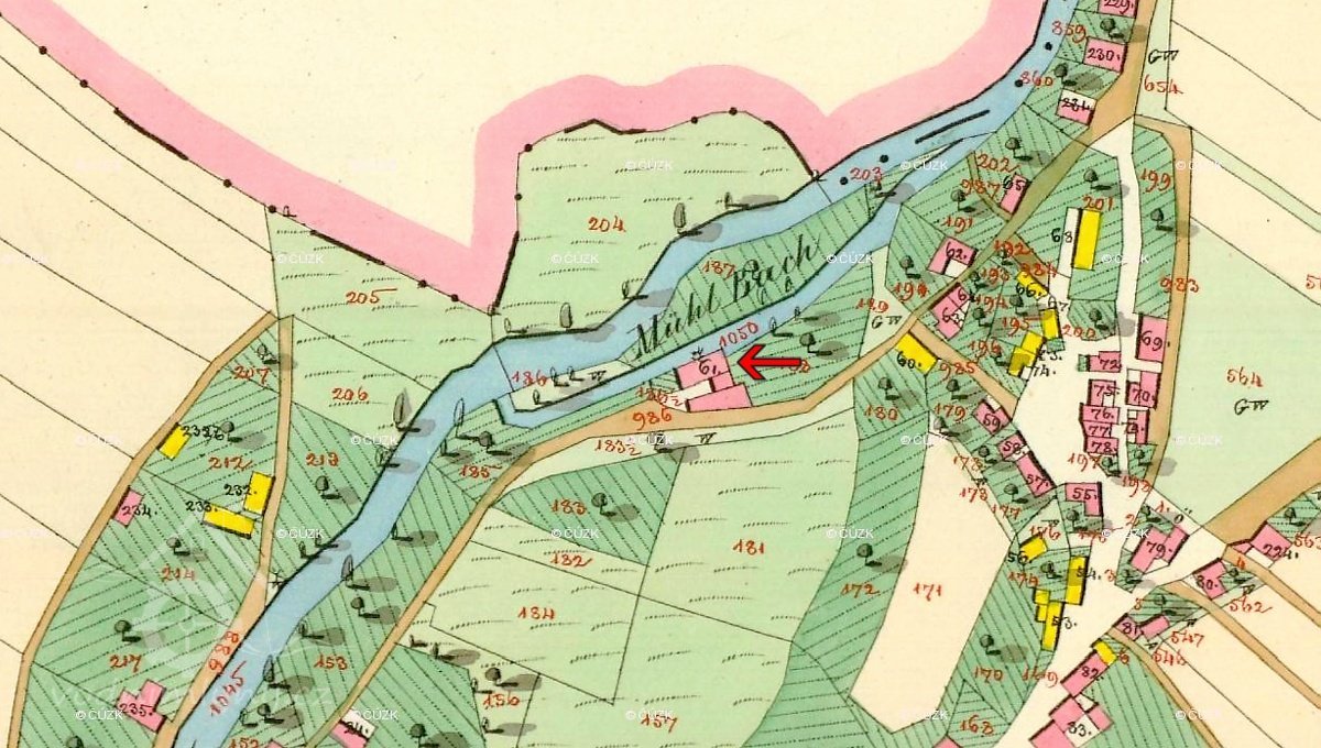 Mlýn vznikl již před rokem 1764, neboť je vyznačen na mapě I. vojenského mapování.