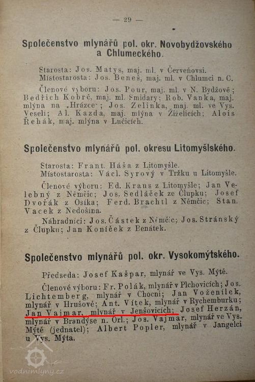 1899 - Jan Vajmar členem výboru Společenstva mlynářů pol okr. Vysokomýtského (Fr, Duška, Kapesní kalendář mlýnů česko-moravských, r. 1899) (HŠ)