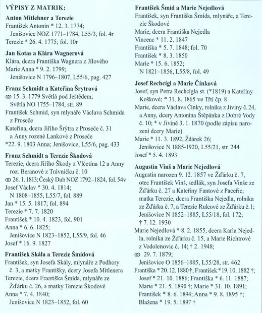 Ke konci 18. st. matriky uvádějí Jana Kotase a jeho manželku Káru rozenou Wagnerovou z Jílového. V roce 1799 koupil Jan Kotas mlýn v Proseči pod Ještědem od tamního mlynáře Františka Šmída (syn Václav Šmída) a odstěhoval tam. Naopak František Šmíd se s manželkou Kateřinou rozenou Šrytrovou z Proseče usadil zde na mlýně ve Žďárku čp. 26. Později ho vystřídal jeho stejnojmenný syn narozený v roce 1785. František Šmíd mladší se v roce 1813 oženil v českodubském kostele s Terezií Škodovou z Vlčetína. Třetí a poslední generaci mlynářů Šmíd představuje opět František, syn předchozího. Narodil se v roce 1823. Za manželku měl Marii Nejedlou. (MH)