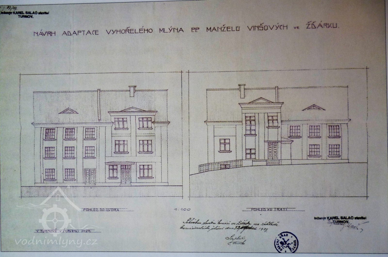 Po Augustinu Vinšovi převzal hospodaření na mlýně jeho syn František Vinš, narozený v roce 1894, Za manželku si vzal Marii Floriánovou z Padouchova. Vzali se 22. října 1922. V roce 1929 přinesl zkázu. 28. dubna 1929 zchvátil budovy mlýna i brusírny velký požár a zcela zničil veškeré zařízení i budovy. František Vinš se rychle vzchopil a budovu mlýna i se zařízením opět obnovil. Plány na stavbu nového mlýna vypracoval v roce 1929 turnovský inženýr Karel Salač, plán na strojní vybavení dodala firma Josefa Prokopa z Pardubic. Již v květnu 1930 požádal František Vinš Okresní úřad v Turnově o vodoprávní řízení a revizi celého vodního díla. Původní dvě mlýnská kola byla tehdy nahrazena Francisovou turbínou s horizontální hřídelí. Kolaudační výměr, kterým byla celá obnovená provozovna schválena, vydal Okresní úřad v Trnově 11. března1932. Proto se mlýnů říká Nový nebo Vinšův. (MH)