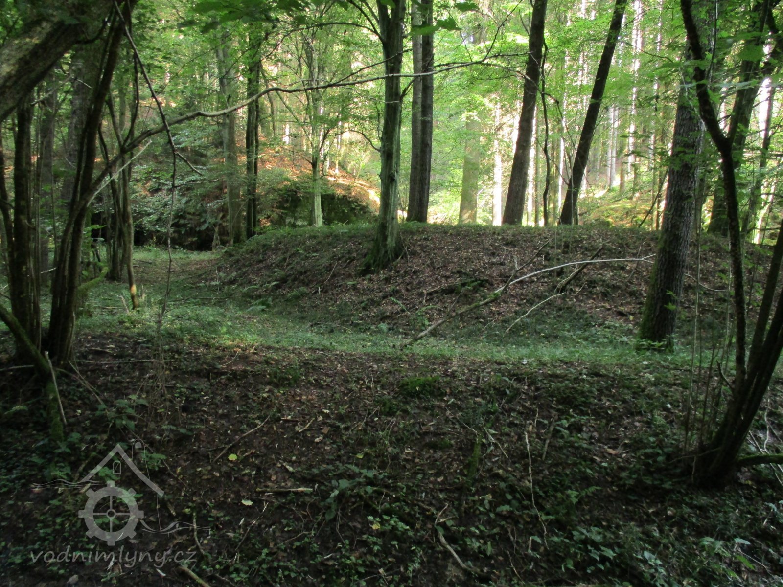 Voda na mlýn s kolem na spodní vodu byla přiváděna tunelem vytesaným ve skále, který byl dlouhý 18 m (dnes zanesen pískem a zeminou). U vchodu do tunelu byly ve skále vytesány zářezy, které sloužily k jeho uzavření. Na pravé straně potoka pak navazuje ve skále propust délky necelých 20 m, která je po obou stranách ve směru po vodě opatřena zářezy pro stavidla. Potok měl v těchto místech malý průtok, proto bylo nutné na provoz mlýna vodu zadržovat. K zadržování vody sloužil val napříč údolím. Od mlýna odtékala voda po levé straně údolí. (MH)