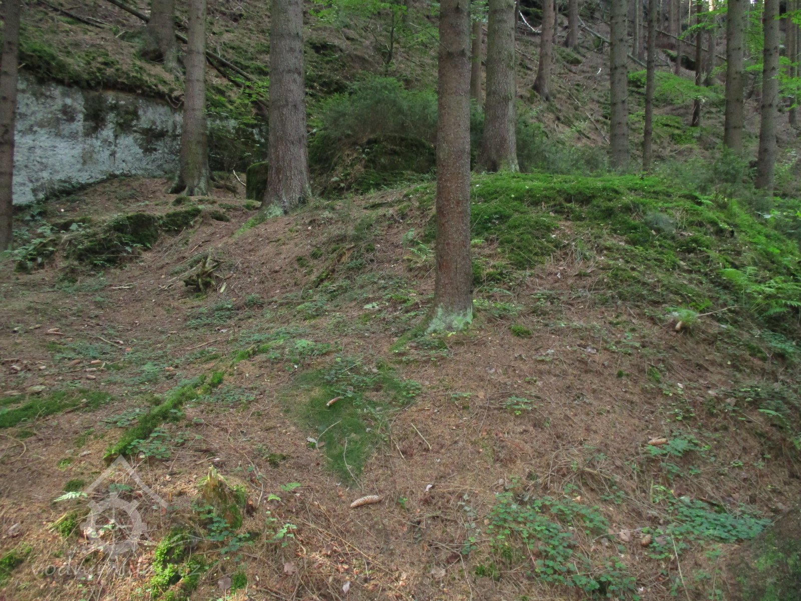Za potokem je patrný zbytek hráze bývalého rybníka.