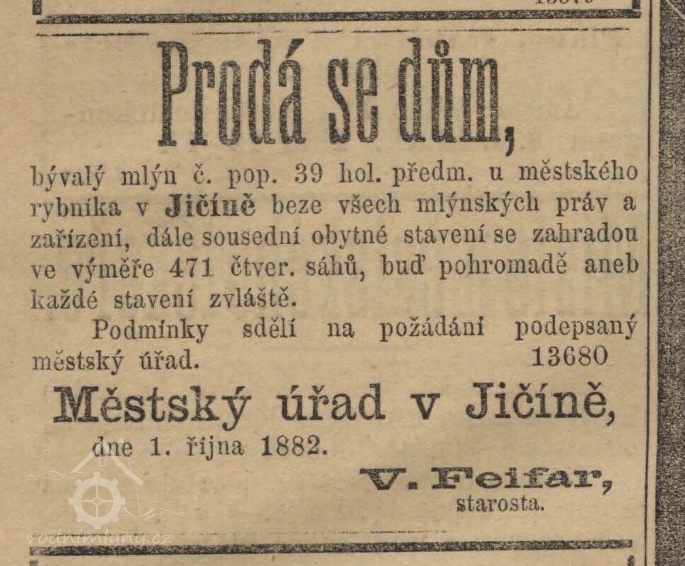 Vroce 1760 prodala obec mlýn takzvaný podvodárský Františku Javůrkovi, ten se však špatně porovnal. proto již v roce 1762 obec prodala mlýn Janu Samohrdovi; ne nadlouho; po roce 1770 Janu Saalovi;Roku 1770 platil ročně mlynář Jan Saal 130 zlatých a za službu při vodárně městské a za bukové a habrové dřevo, kterým v zimě vodárnu vytápěl dostal 15 zlatých a 30 krejcarů. 1791 koupili mlýn od vdovy Kateřiny Saalové a sirotků manželé František a Viktorie Šefelinovi, v roc1794 Václav a Rosálie Riegrovi, 1798 Matěj Půhonný, 1799 Josef a Kateřina Machačkovi; roku 1816 dědil mlýn Václav Machačka. Roku 1846 koupil mlýn,zahradu pole a luka Adolf Laurich z Jablonce, přistavěl k mlýnu vysoký komín a na pohon koupil parní stroj (první v Jičíně). Mlýn vyhořel toho roku a přešel na Jana Schmidta, pak na Jana Neuberta.