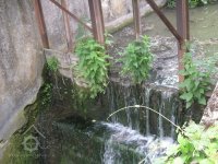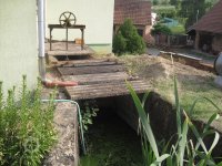 Betonové koryto přivádějící vodu k vodnímu motoru - a stavidlo před ním, květen 2016, © Dušan Žatecký, (Prvky na obrázku: náhon, stavidlo, vantroky)