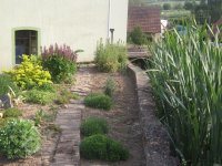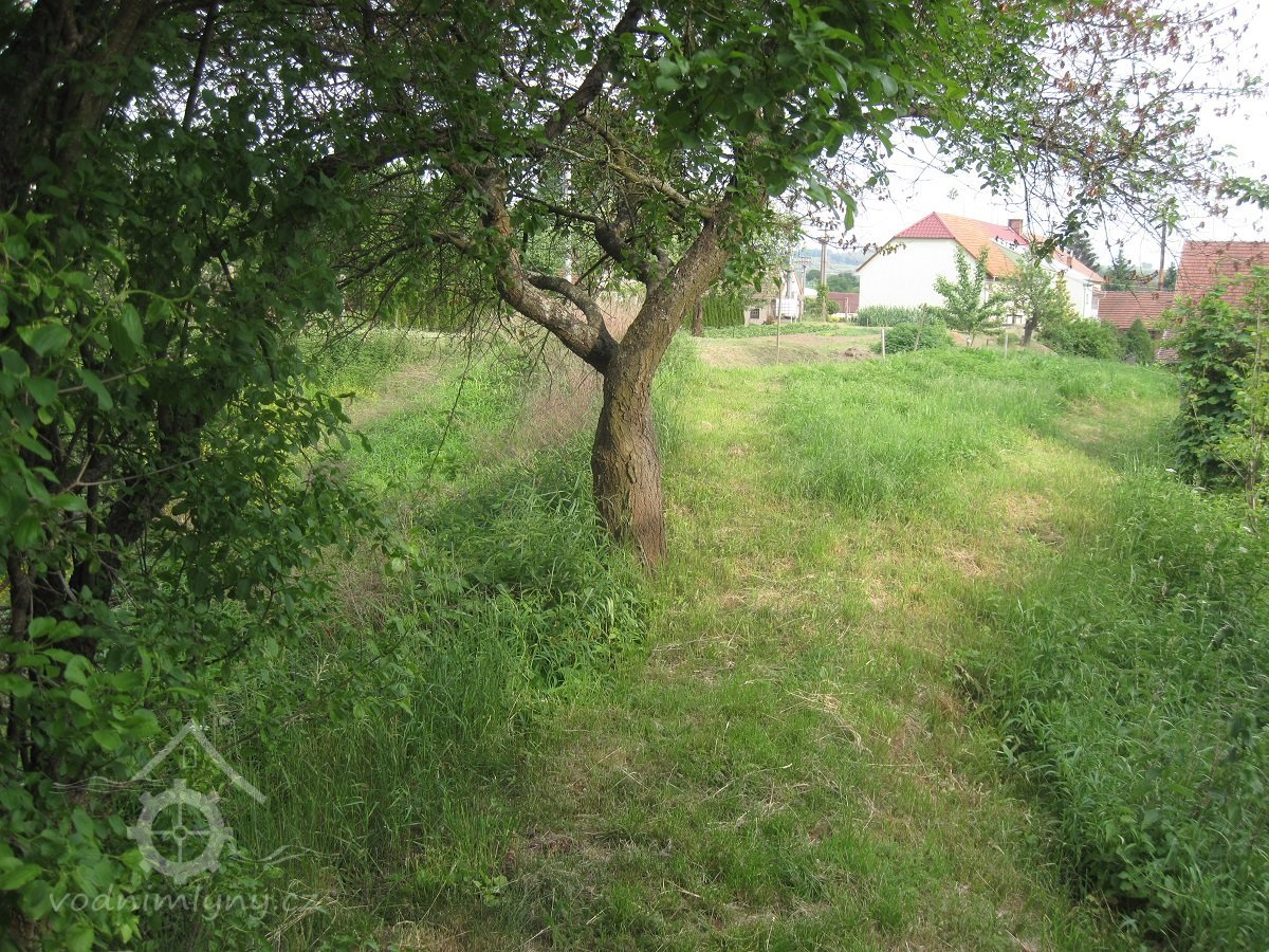 Pohled ze současného jezu k mlýnu. Mezi štítem mlýna (s valbičkou) a kmenem ovocného stromu patrná obdělaná plocha - tj. zasypaná část náhonu, květen 2016, © Dušan Žatecký