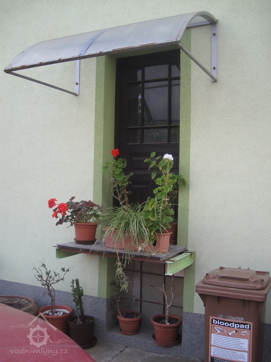 Západní, návodní zeď mlýna. Mezi dveřmi a stavidlem patrná stavební spára (svislý bílý pruh je nároží jižního dílu severní části dnešní budovy). Vpravo lednice, květen 2016, © Dušan Žatecký, (Prvky na obrázku: stavidlo, lednice)