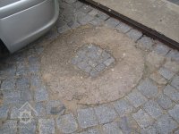 Mlecí kámen v dlažbě před východním průčelím dnešní budovy, květen 2016, © Dušan Žatecký, (Prvky na obrázku: mlecí kámen)
