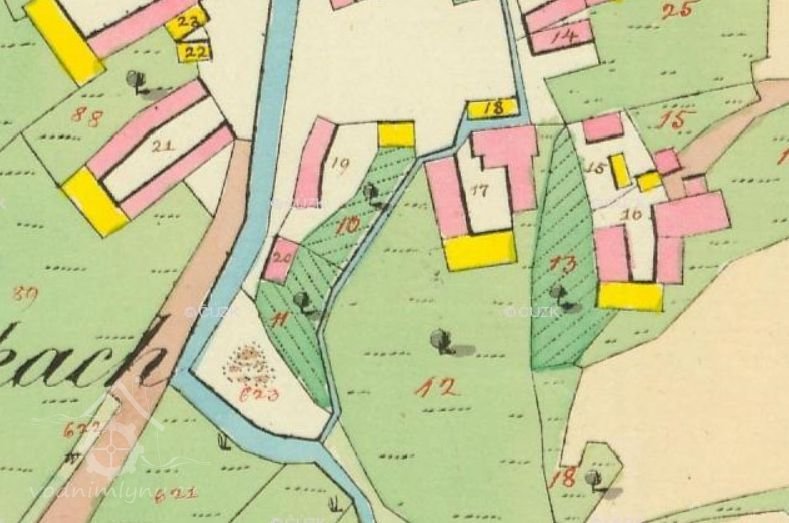 PopisV roce 1930 pohání mlýn a pilu 2 kola na svrchní vodu, průtok 190 l/s, spád vody 3 m, výkon 5 HP.