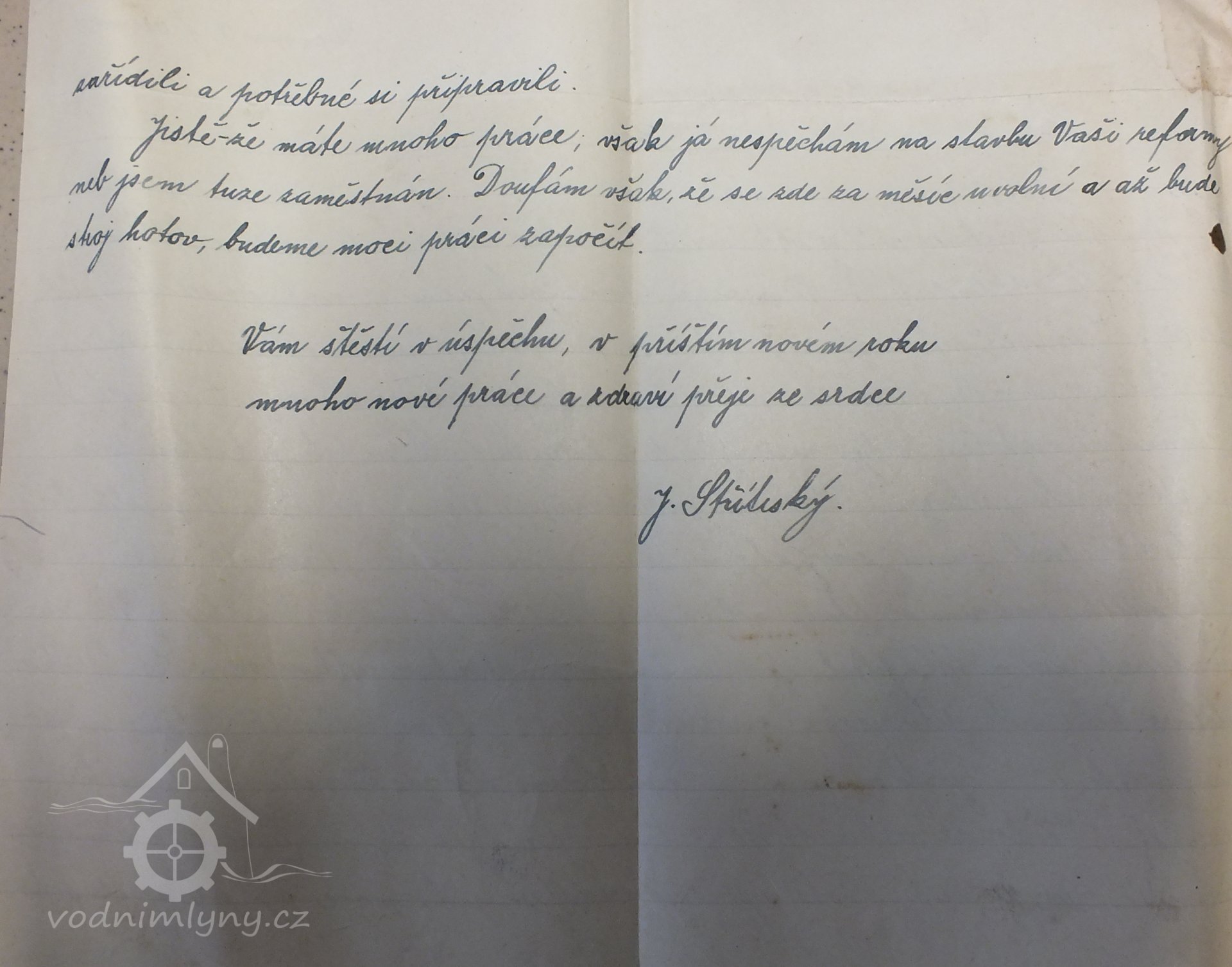 PopisV roce 1930 mlýn pohání kolo na svrchní vodu s průtokem 0.075 m3/s, spádem 4.1 m o výkonu 3.5 k.