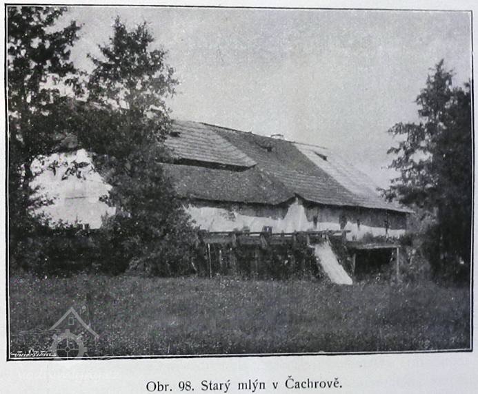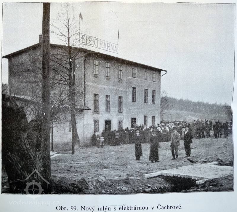 V roce 1902 založené družstvo rolnické elektrárny v Čachrově koupilo starý mlýn situovaný v údolí jihovýchodně od obce. Vodní síla mlýna 8 ks nebyla efektivně využita. Díky požáru družstvo postavilo novou budovu elektrárny a mlýn pro mletí členů družstva. Úpravami potoka získali čachrovští spád přes 6 m a hltnost 300 l/s-1 a výkon 30 ks. Mlýn zužitkoval 11 ks a díky usnesení družstva bylo pořízeno od Františka Křižíka dynamo k výrobě stejnosměrného elektrického proudu, který poháněl motory pro mlácení, řezání řezanky, šrotovník, cirkulárky, čerpadlo obecního vodovodu a večer dynamo obec osvětlovalo. Výstavba mlýna kombinovaného s elektrárnou umožnila čachrovským řádně a včas semlet své obilí a nebyli tak nuceni vozit obilí k mletí daleko. Nový prostorný mlýn umožnil i jeho skladování. Ve mlýně byla zařízena elektrická strojová výroba šindele. Ceny proudu byly stanoveny za období jednoho roku mírně, za žárovku o svítivosti 16 svíček se platilo 12 K, za 10 svíčkovou 8 K, pro osvětlení stájí dokonce jen 6 K. Za sílu motorovou k pohonu mlátiček se od členů družstva vybírala 1 K za hodinu a od nečlenů 1 K 25 h s příplatkem 25 % na mazání. Obec měla v roce 1902 400 obyvatel a bylo zde osazeno 180 žárovek a 10 ks výkonu zemědělských elektromotorů.