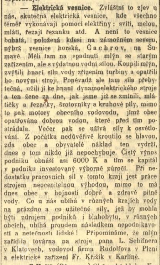 Starý mlýn přestavěný Františkem Křižíkem na objednávku čachrovského družstva na malou rolnickou elektrárnu, kdy funkce mlýna byla současně zachována.