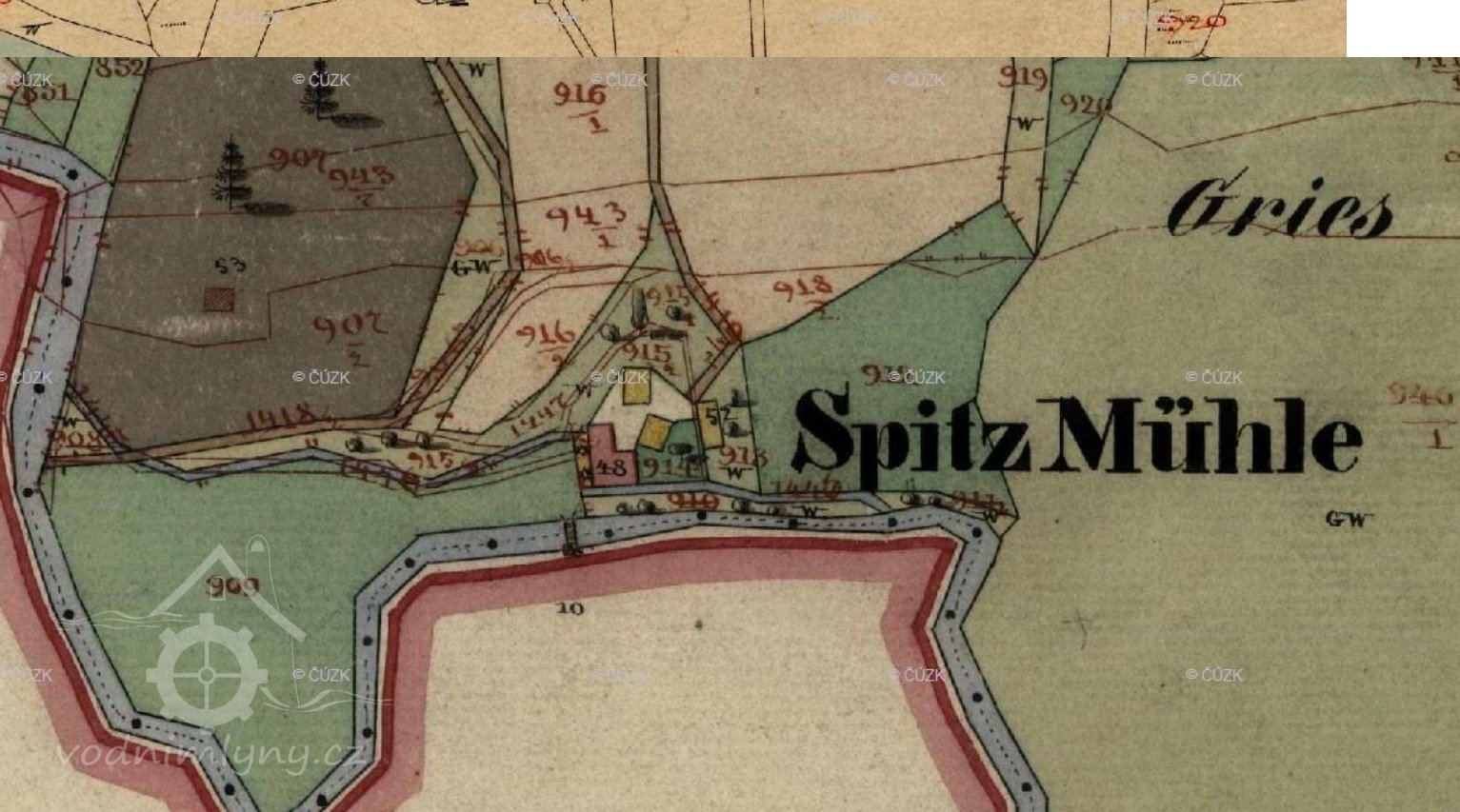 Popis1930: 1 kolo na svrchní vodu, hltnost 0,194 m3/s, spád 3,3 m, výkon 5,5 HP