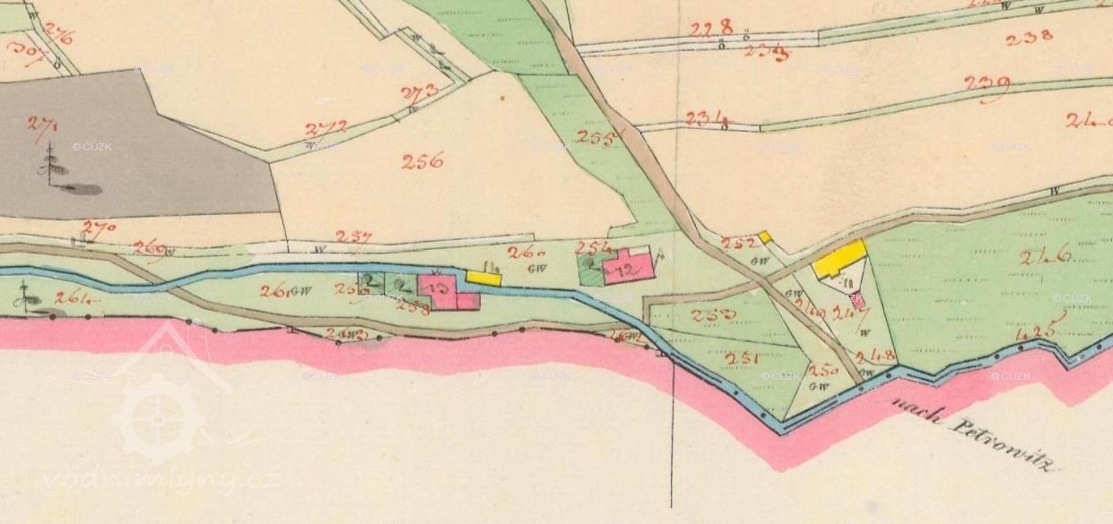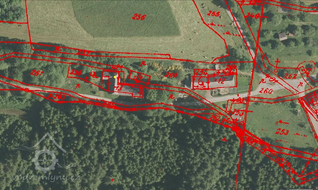 PopisV roce 1930 pohání mlýn a pilu dvě kola na svrchní vodu s průtokem 0.1 a 0.08 m3/s, spádem 4.1 a 3.8 m o výkonu 3.5 a 2.6 HP.