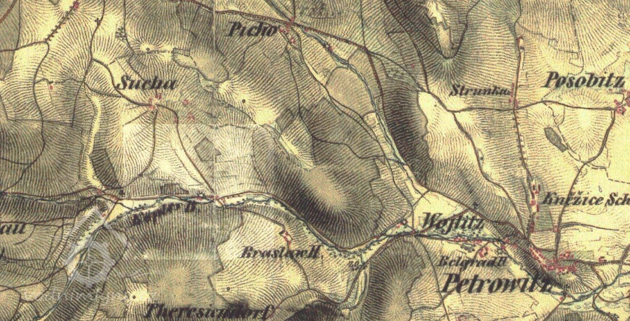 750 metrů jižně od Suché, po směru toku Kepelského potoka mezi Zvíkovem a Petrovicemi