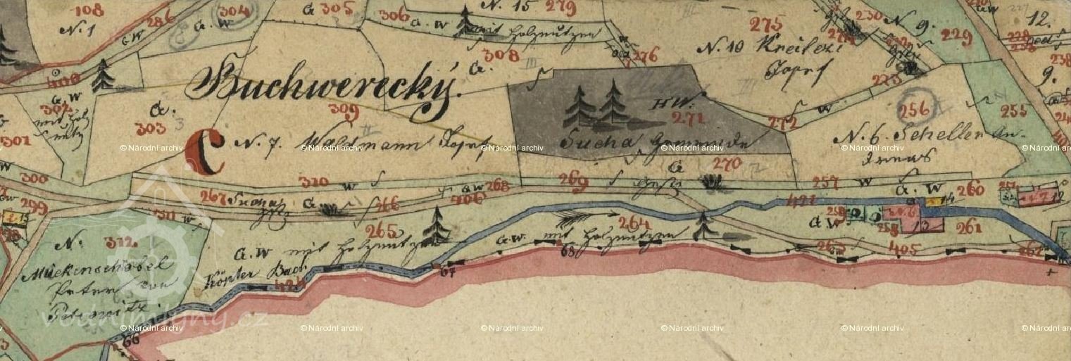 V pozemkové knize Sušice 144 je na fól. 47 zápis, ve kterém vdova Kateřina Nerudová postupuje dne 1. ledna 1756 mlýn s dvojím složením, jednou stoupou a pilou svému synu Václavu Nerudovi. Dne 30.dubna 1842 koupili Jakub a Kateřina Luhanovi mlýn s pilou v Puchverku s čp. 6 od manželů Antonína a Vincencie Ludvíkových za trhovou cenu 1 840 zlatých. (Vratislav Macaš)