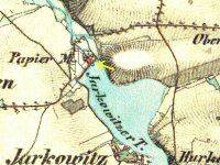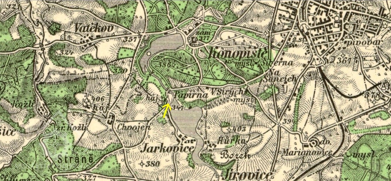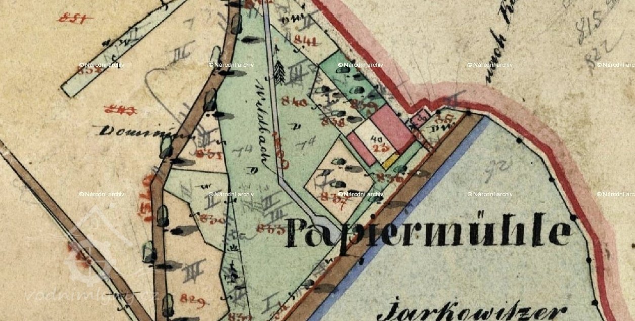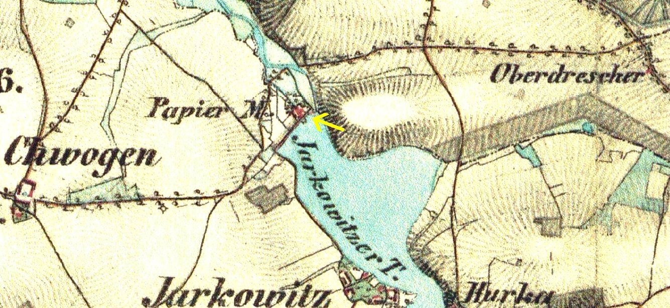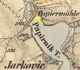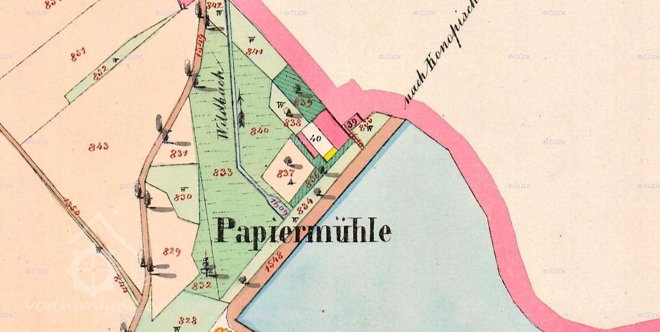 Papírna byla založena v roce 1793 Františkem Geiszlerem, který do té doby provozoval papírnu v Postupicích. Budova byla 32 m dlouhá a 15 m široká, v přízemí byly umístěny papírnické dílny a obydlí, v podkroví dva byty a komory, na půdě se sušil papír. Podnik bohužel příliš neprosperoval. Roku 1837 byl při papírně zřízena mlýnice, v roce 1851 jej koupil Jan Karel z Lobkowicz, majitel panství v Konopišti. Ten papírnu zrušil a výrobu přemenil na stupník k drcení kostí pro výrobu spodia pro panský cukrovar. Později objekt sloužil jako pila, kolem roku 1900 přestavěn na obydlí pro zaměstnance panství. Vedlejší mlýn byl pronajímán. V roce 1906 byla papírna s mlýnem poškozena povodní a následně stržena. Na místě byly zřízeny sádky s obydlím baštýře.