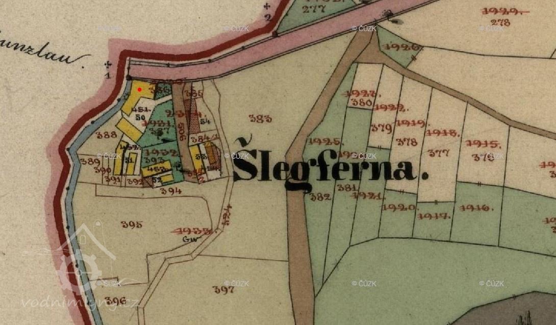 1738 zápis v urbáři: Jan Štěpánek. Mlýn Šlejferna, řečenej panskej o jednom složení na rubničné vodě. Mlynář platí ročně 22 strýchů žita a za vykrmení svinského skotu 17 zl.