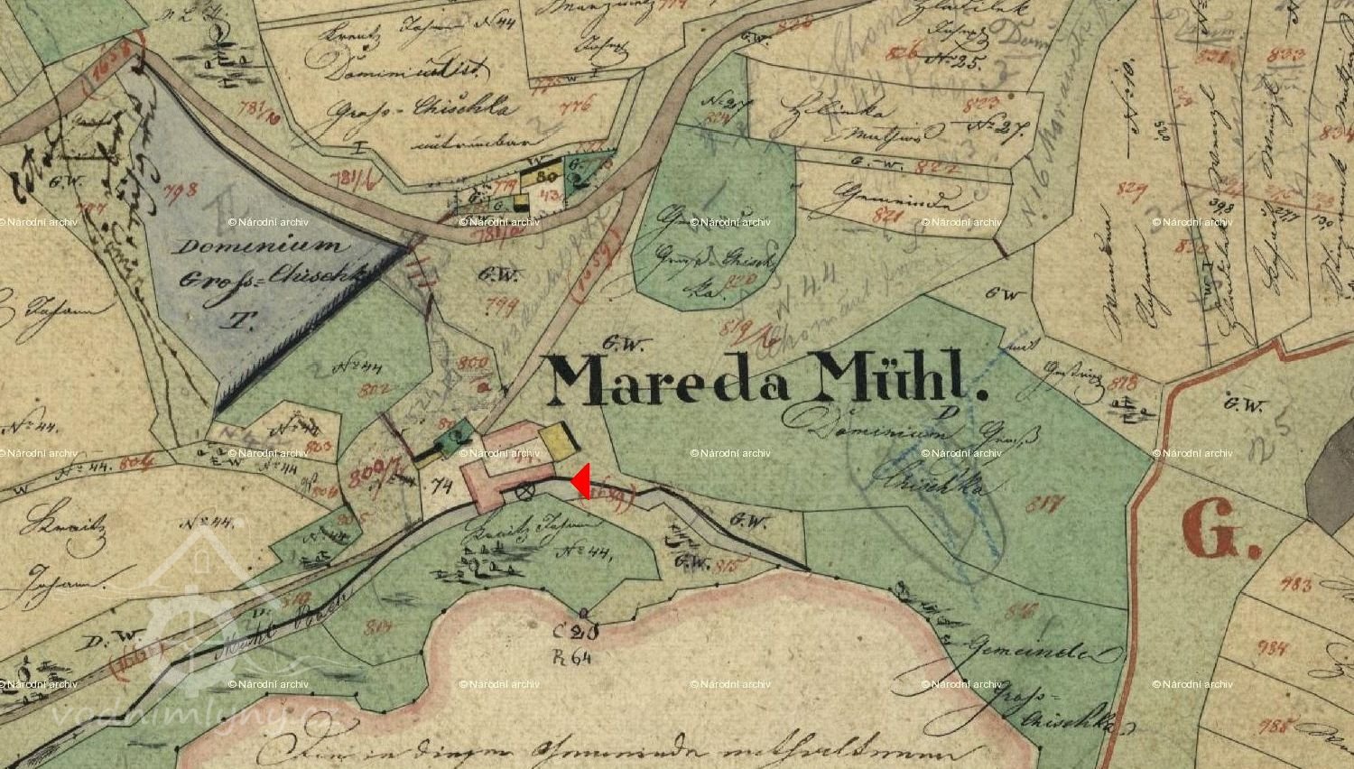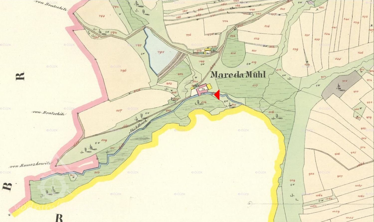 Juvenes Franciscum Mareda cum honeste virgine Anna superstite filia post defunctus Josefum Kotal ambo sub. ... - mládenec František Mareda s ctihodnou pannou pozůstalou dcerou po zemřelém Josefu Kotalovi oba poddaní. 2. února 1740., jejich syn František Augustin nar. 11. října 1742 (v matrice Velké Chyšky při jeho narození s. 49 se píše o jeho otci Franciscus Kreitz aliter Mareda - ...jinak Mareda?, že by přijal jméno po "usedlosti", jak bylo tehdy zvykem?), si pak vzal dceru Františka Rajského mlynáře v obecním mlýně v Mladé Vožici Marii Annu, tam je uveden v matrice jako Kreitz (19. 1. 1768).