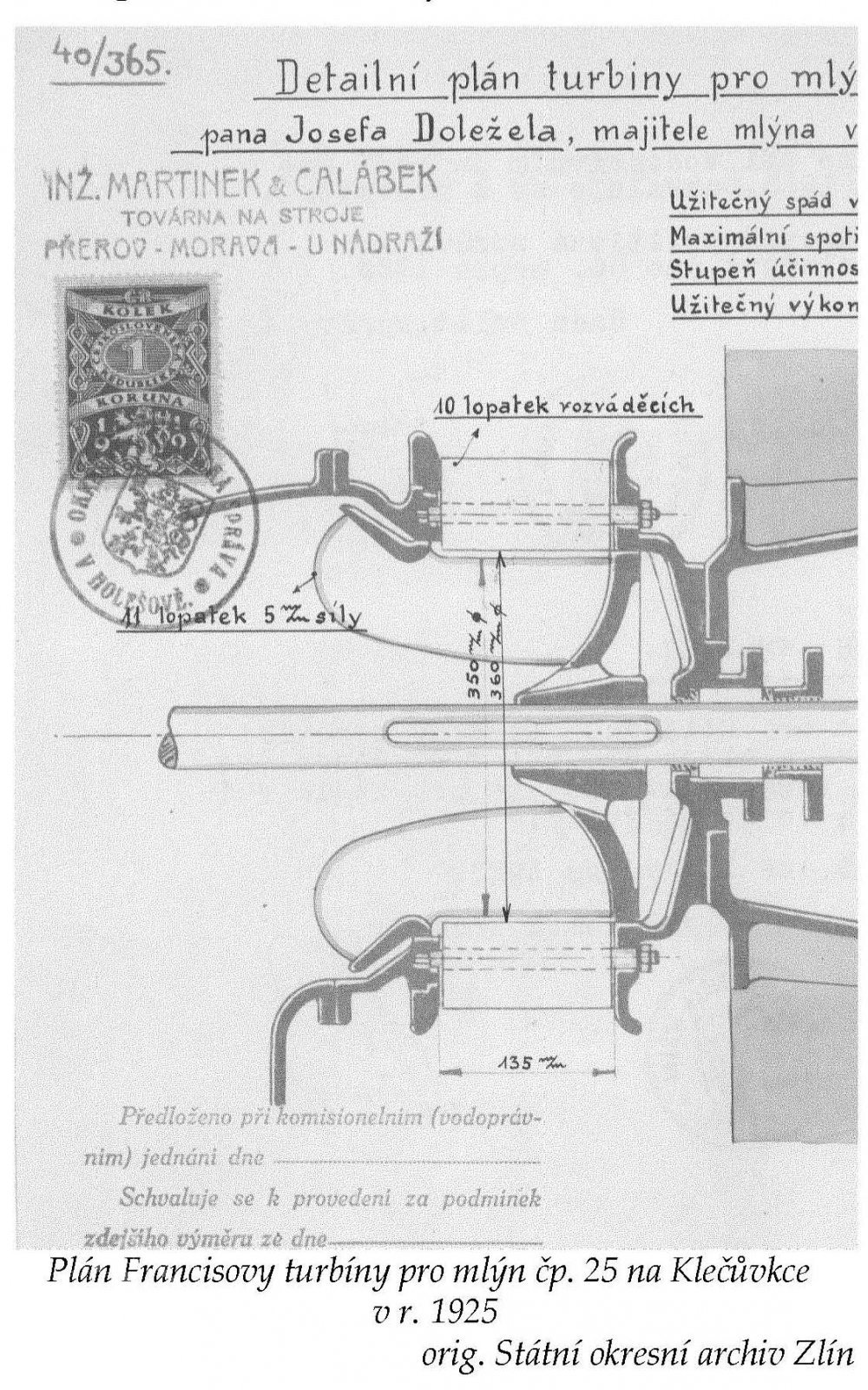 Popis1930: 1 turbína Francis, hltnost 0,146 m3/s, spád 3,3 m, výkon 5 HP