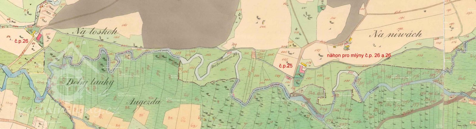 Voda přicházela ke mlýnům č.p. 25 a 26 od jezu na Slušovické Dřevnici náhonem dlouhým celkem cca 1,77 km (délka společného náhonu pro oba mlýny byla asi cca 0,6 km). Ve vzdálenosti 9 m nad jezem bylo zřízeno stavidlo.
