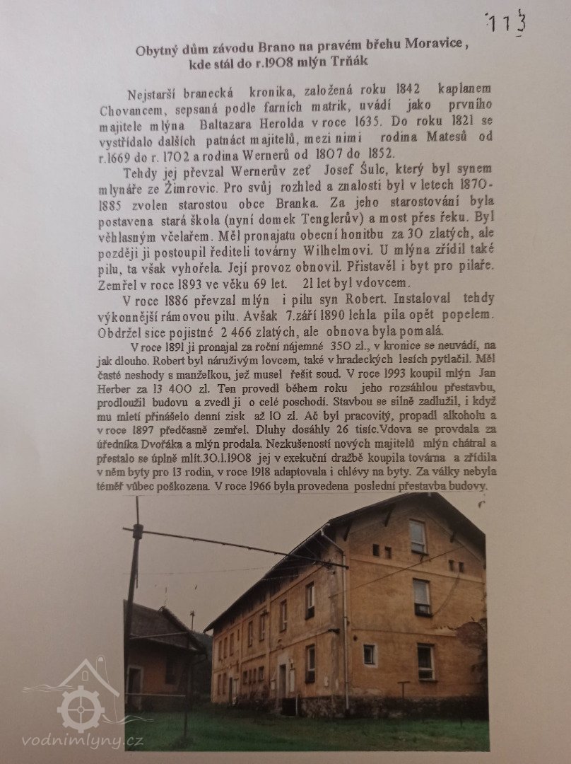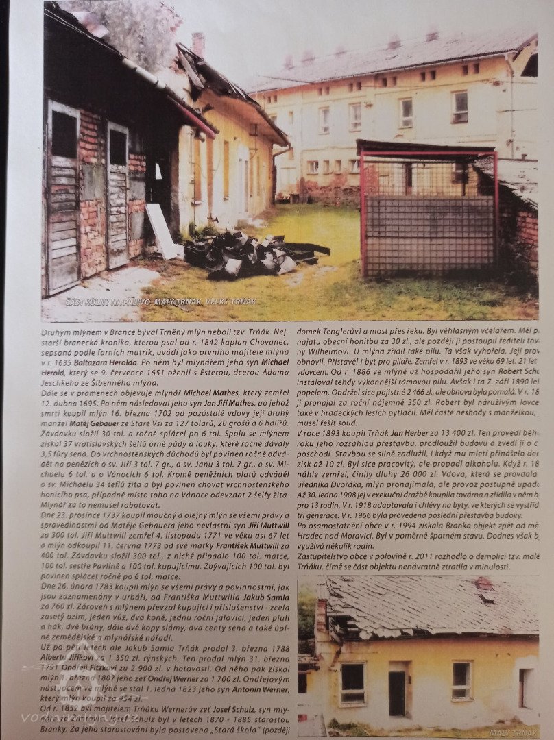 Dne 26. února 1783 koupil mlýn zvaný Trňák čp. 1 se všemi právy a povinnostmi, tak jak jsou zaznamenány v urbáři od Františka Muttwilla Jakub Samla za 760 zl. Zárověn s mlýnem převzal kupující i příslušenství a to: zcela zasetý ozim, jeden vůz, dva koně, jednu roční jalovici, jeden pluh a hák, dvoje brány, dále dvě kopy slámy, dva centy sena, úplné zemědělské a mlynářské nářadí „tak dobré, jak bylo po ruce“. Už po pěti letech ale Jakub Samla Trňák prodal 3. března 1788 Albertu Jiříkovi za 1350 zl. rýnských. Ten prodal mlýn 31. března 1791 Ondřeji Fitzkovi za 2900 zl. v hotovosti. Od něho pak získal mlýn 1. března 1807 jeho zeť Ondřej Werner za 1700 zl. Ondřejovým nástupcem na mlýně se stal 1. ledna 1823 jeho syn Antonín Werner, který mlýn koupil za 954 zl. M. M. (=Metall Münze). Od roku 1852 byl majitelem Trňáku Wernerův zeť Josef Schulz, syn mlynáře z Žimrovic. Josef Schulz byl v letech 1870-85 starostou Branky. Kromě toho býval i věhlasným včelařem. Nechal také mlýn rozšířit o pilu, která ale později vyhořela. Zemřel v roce 1893 ve věku 69 let. Od roku 1886 však na mlýně už hospodařil jeho syn Robert Schulz.