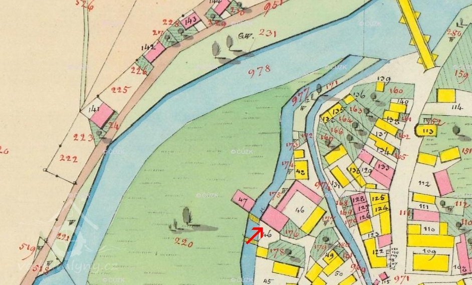 PopisV r. 1930 zde byla 2 kola na spodní vodu, první s průtokem 0,807 m3/s, druhé 0,493 m3/s, spád obou 2 m, celkový výkon 21 k, tj.15,54 kW