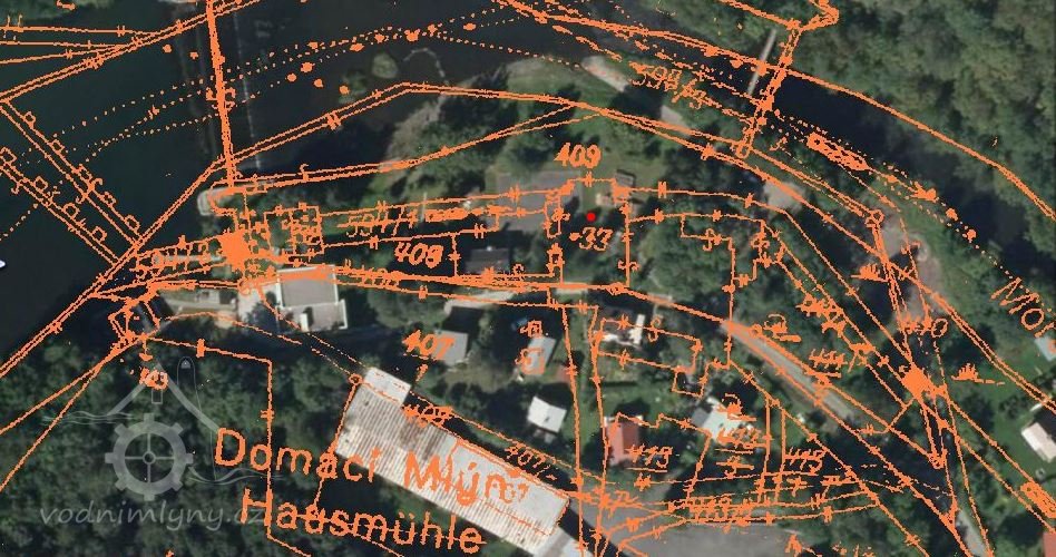 Popis1930: 1 kolo na spodní vodu, hltnost 2,6 m3/s, spád 1,3 m, výkon 13,5 HP
