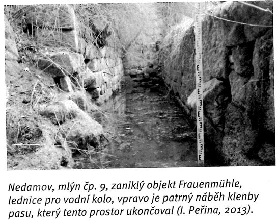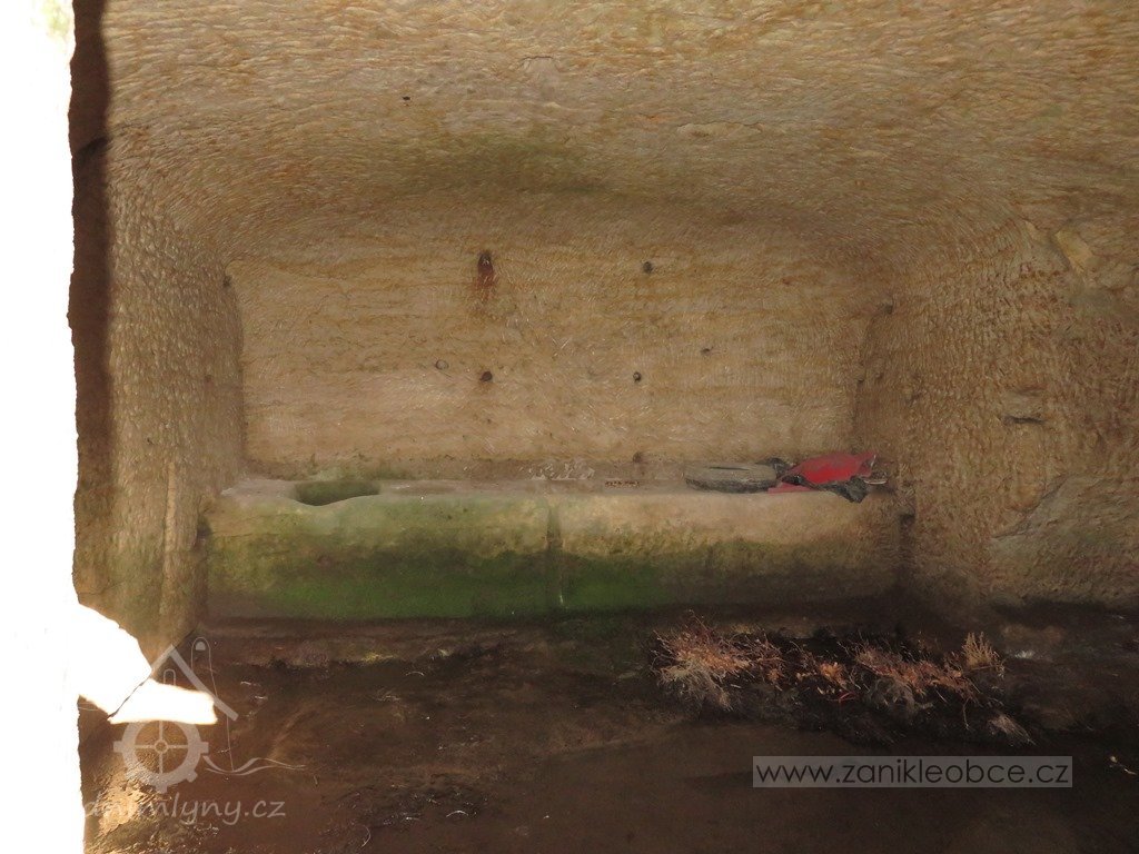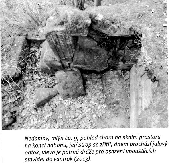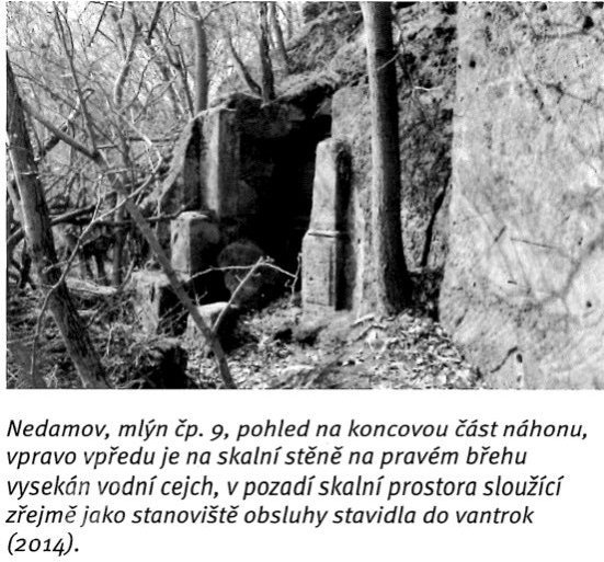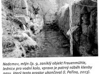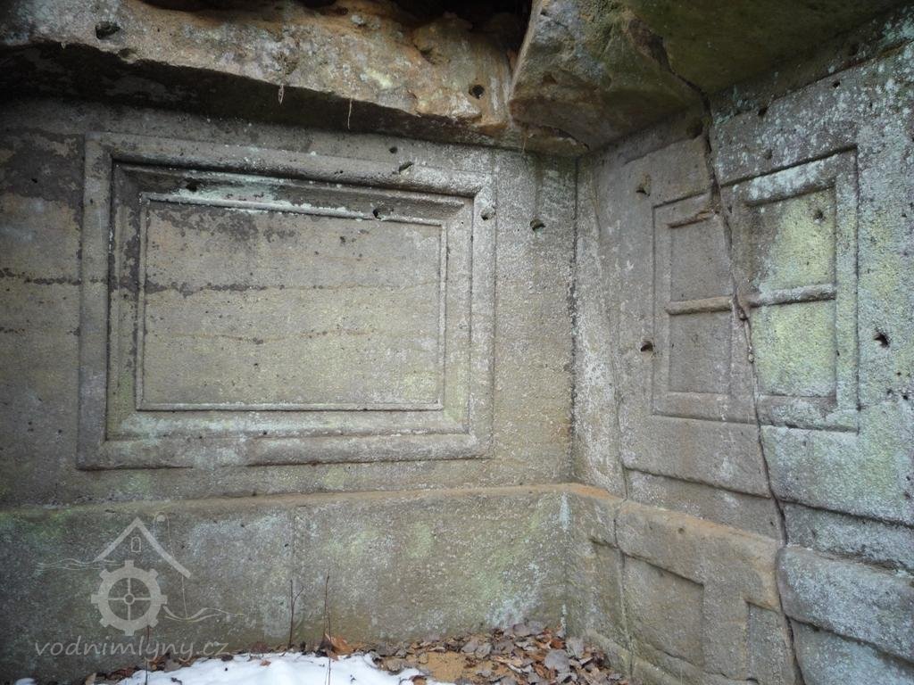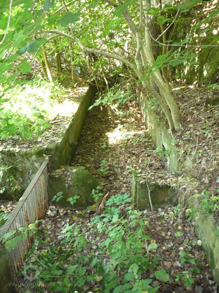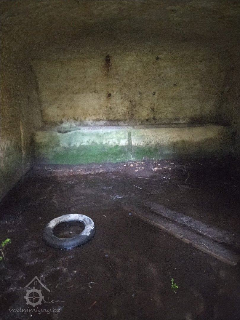 Vzadu, na konci náhonu vpravo, je místnůstka, sloužící jako akumulační nádržka, kde je vytesán kříž a dochovalo se slepé okno a výklenek, nejspíše pro svatý obrázek a sošku., 08 2011, © Vladimír Kraus, (Prvky na obrázku: náhon, akumulační nádržka)