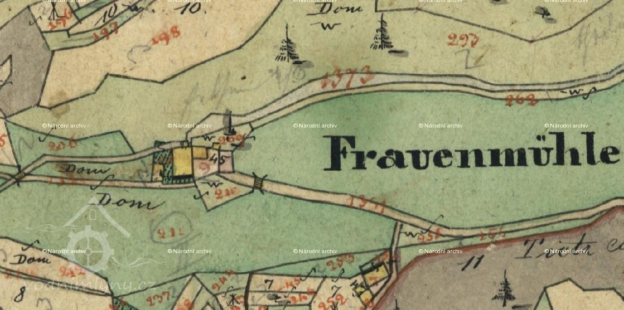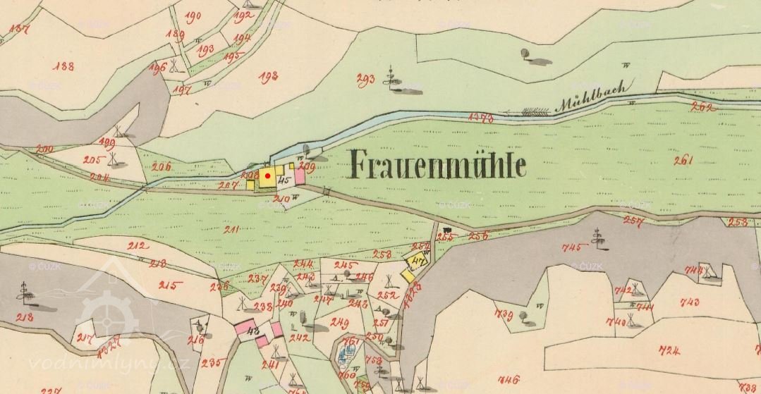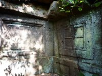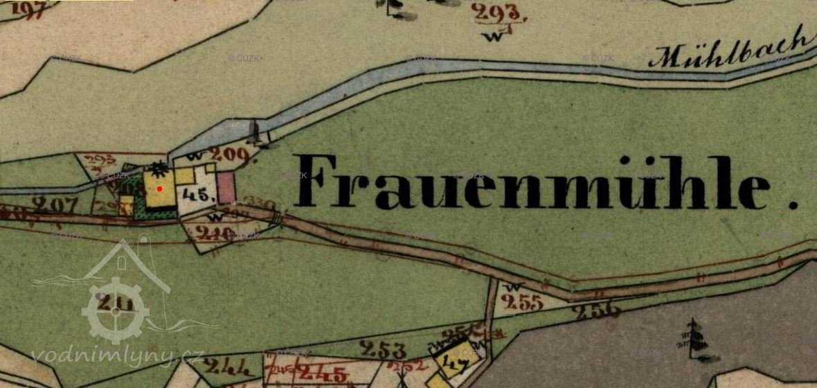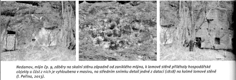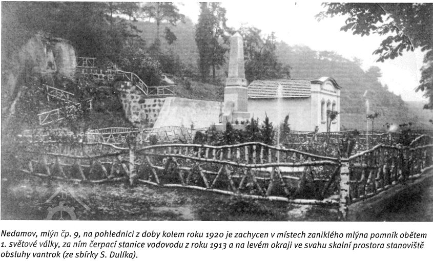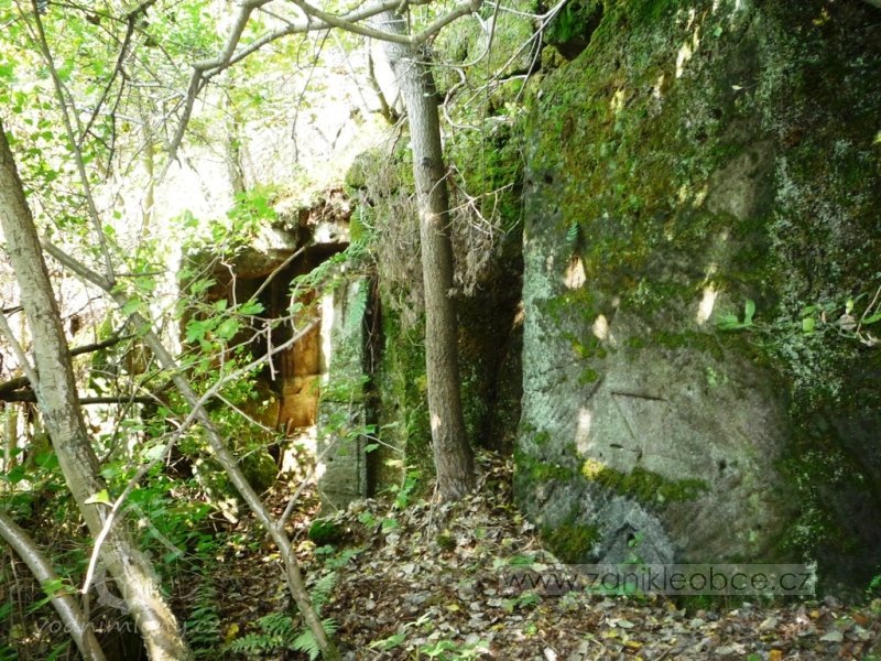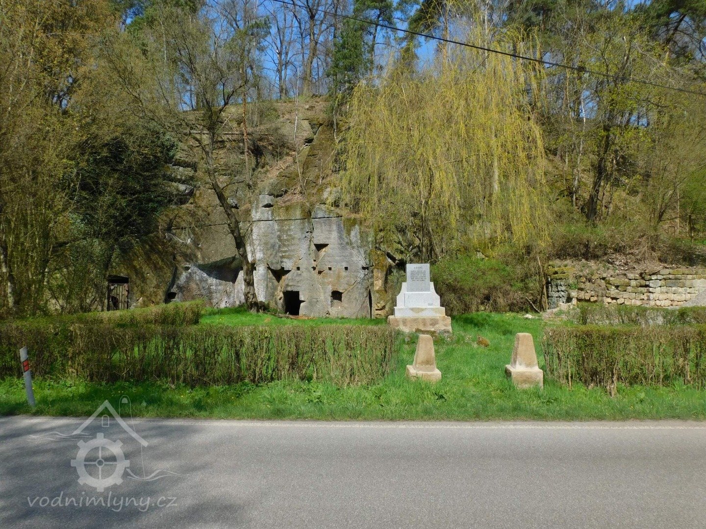 Vzadu, na konci náhonu vpravo, je místnůstka, sloužící jako akumulační nádržka, kde je vytesán kříž a dochovalo se slepé okno a výklenek, nejspíše pro svatý obrázek a sošku., 08 2011, © Vladimír Kraus, (Prvky na obrázku: náhon, akumulační nádržka)