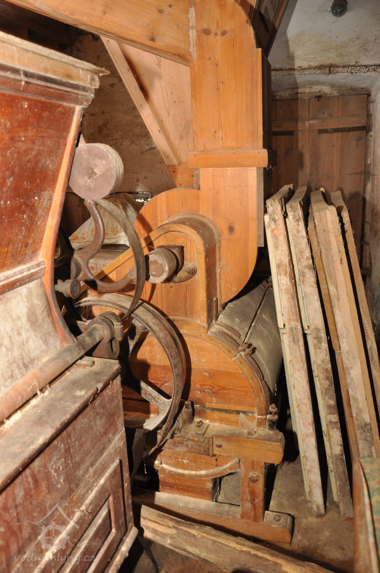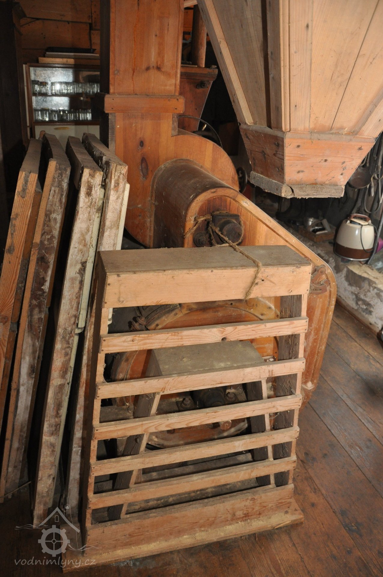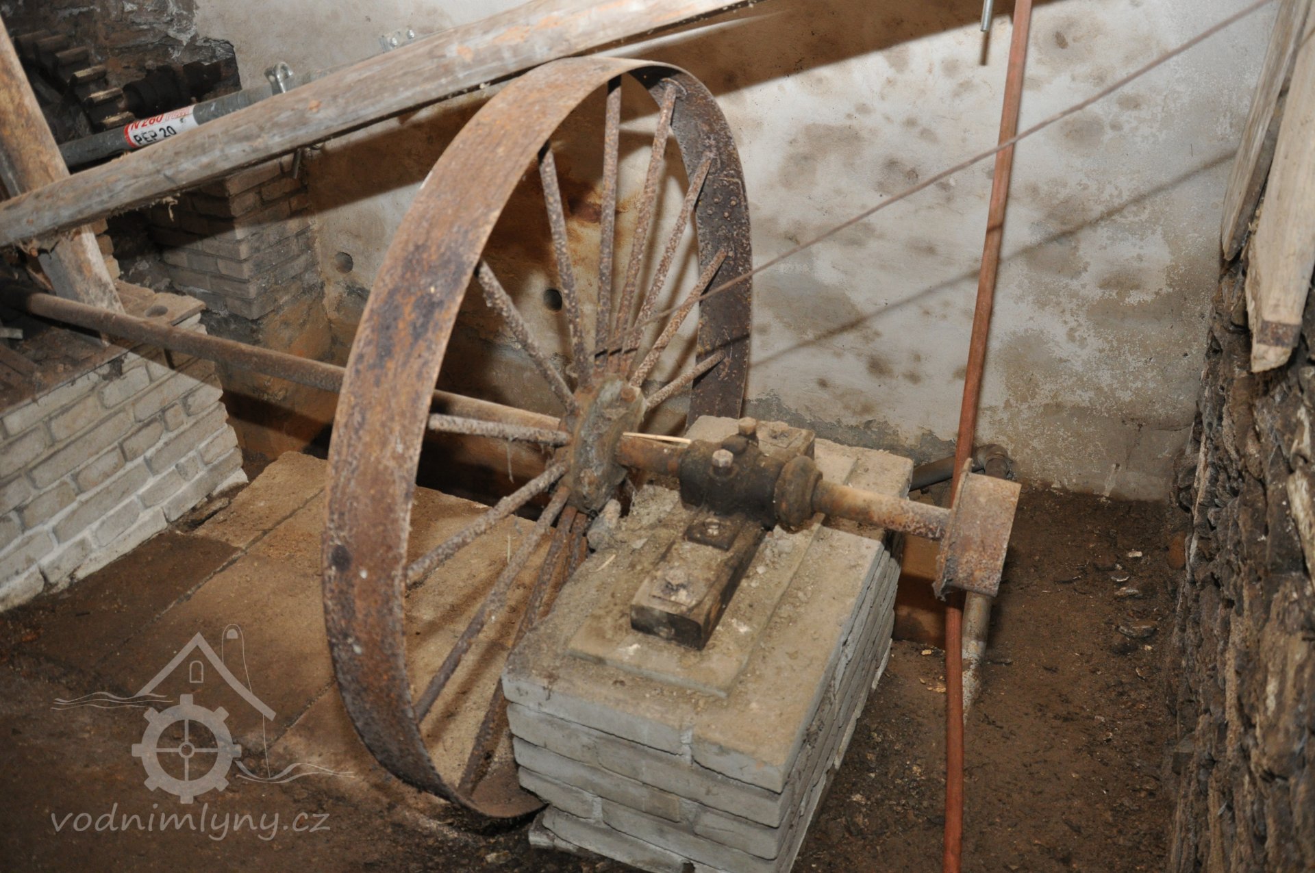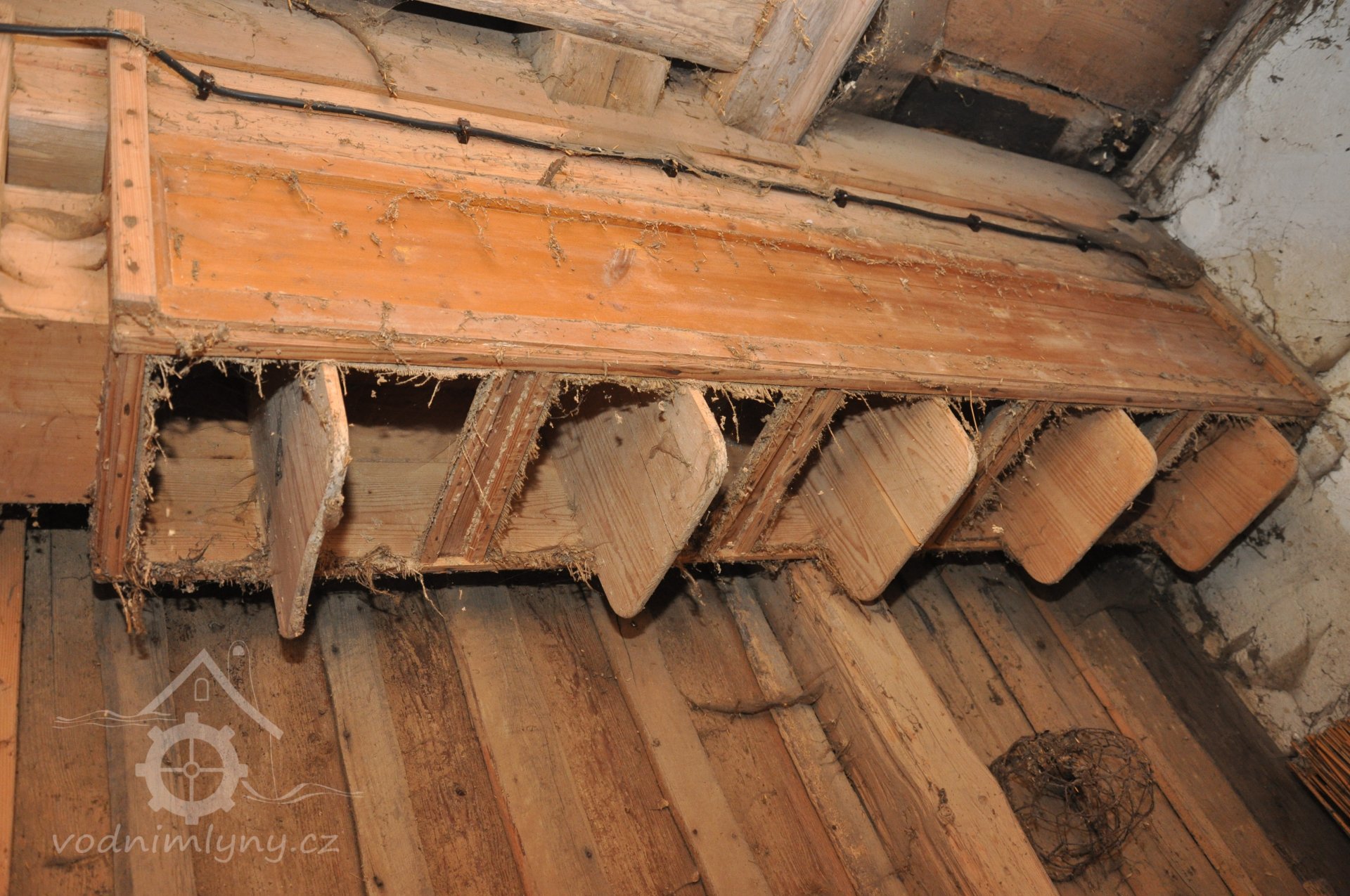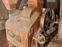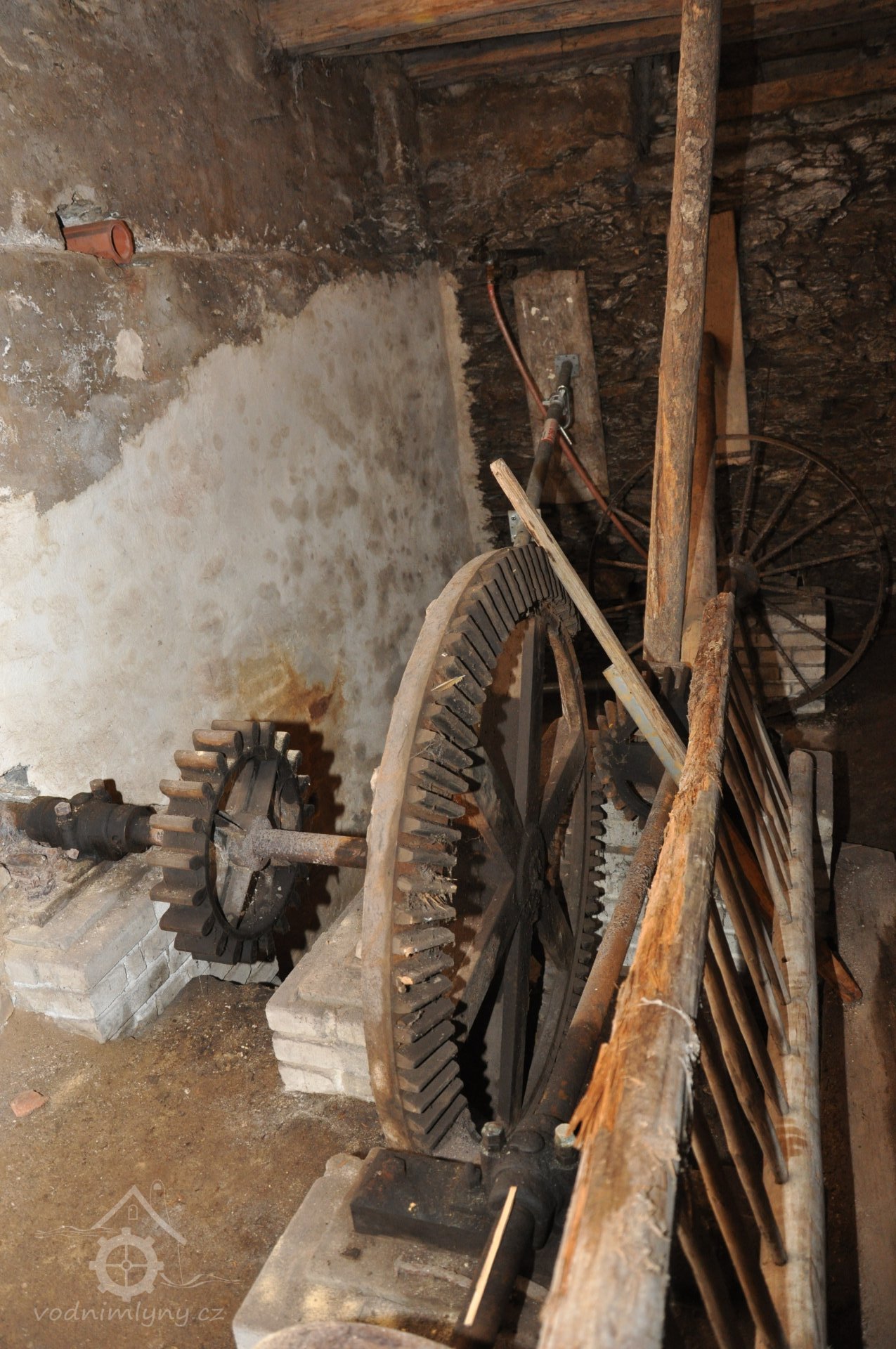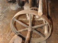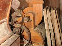 - Na transmisi v podstřeší je dřevěná kladka, která za pomoci lana jdoucího skrz střešní otvory (vzácně dochováno) roztáčela ještě malou transmisi ve stodole pohánějící mlátičku a další zemědělské stroje.