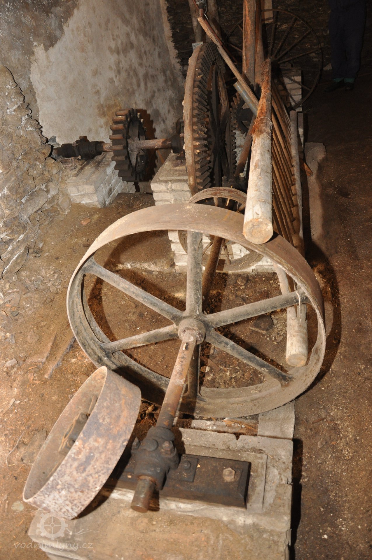 - V podkolí nachází se částečně dochovaný převod a transmise. Pracovalo zde celodřevěné vodní kolo na vrchní vodu osazené na dřevěné hřídeli, která otvorem procházela dovnitř mlýnice, osazená s kovovými čepy v kluzných ložiskách. Na dřevěné hřídeli bylo paleční kolo s čelními palci (tyto dřevěné části nedochovány, hřídelový otvor zazděn), palce tohoto kola zapadaly do pastorku na předlohové hřídeli, na které je osazeno litinové paleční kolo (s bočními palci), které tvoří s pastorkem na hlavní transmisi pravoúhlý převod. Na hlavní transmisi je několik litinových řemenic, hřídele jsou uloženy v ložiscích kroužkomazného systému.