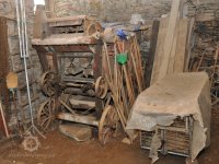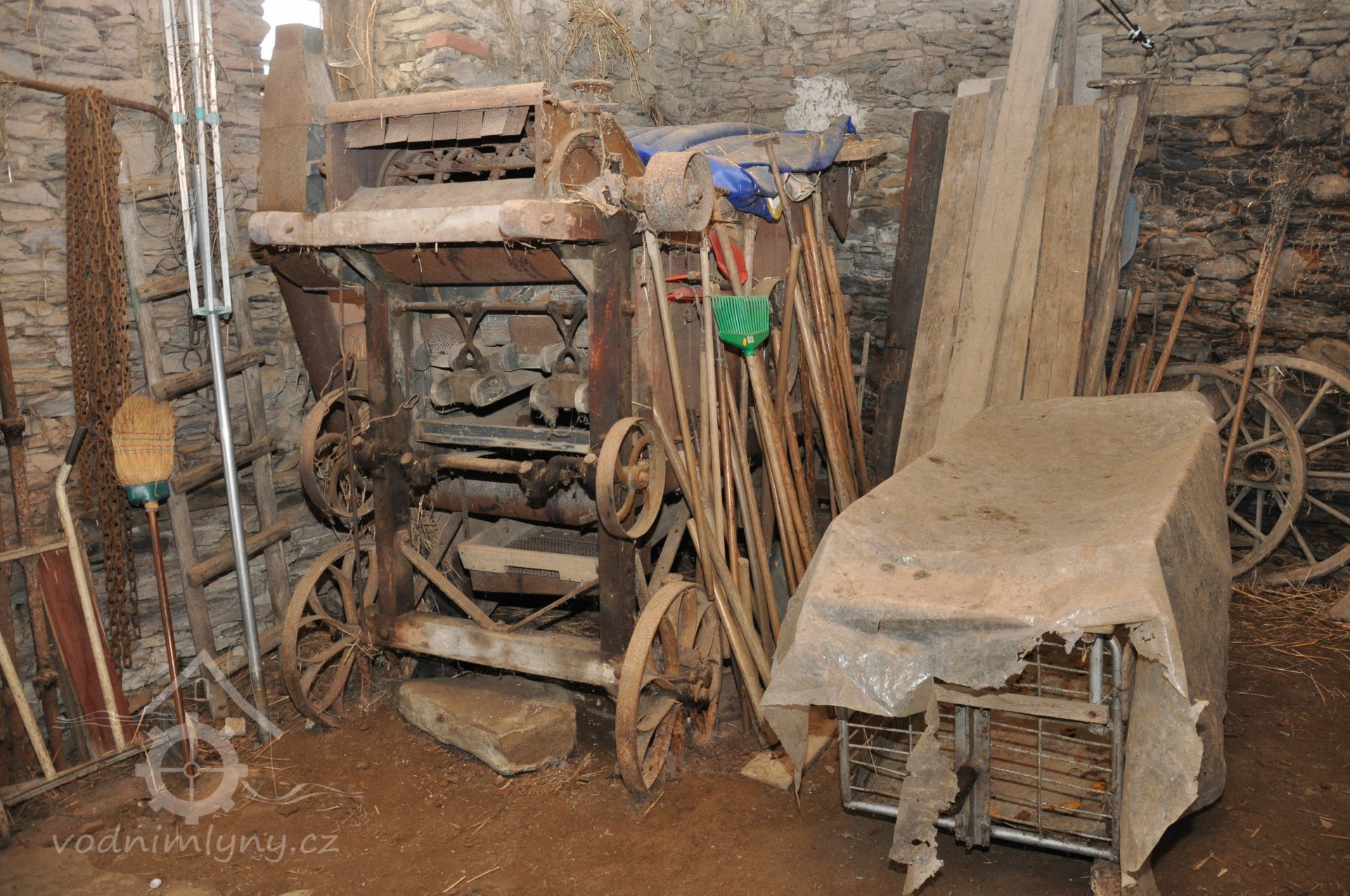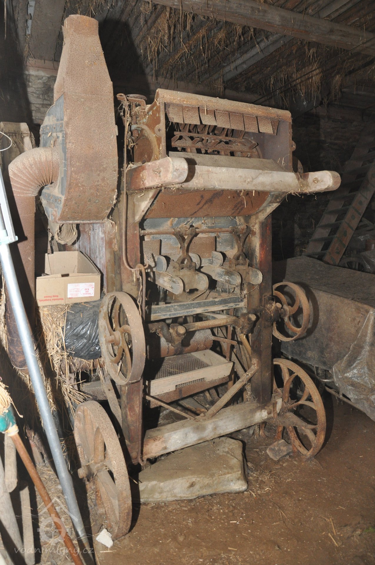 Vzácně dochovaná soustava lanového převodu k pohonu zemědělských a ostatních strojů. Zachována ve stodole původní mlátička. -- D.V.
