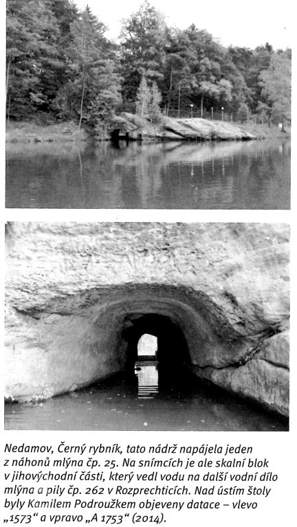 Prvním zdrojem náhonu byl dnes nefunkční odtok z Černého rybníka v Nedamově . Odtok byl napájen z výpusti na jv okraji dolní hráze (dochován propustek s česly), kterou tvoří vystupující pískovcový skalní blok. Skrz něj je vysekaná vysoká štola se segmentově tvarovaným stropem. Nad vrcholem ústí štoly je patrná datace "A 1753" a ve zvětralé stěnmě vedle ní obtížně čitelný letopočet "1573". V zadní části štoly je v obou bočních stěnách naproti sobě několik svislých a šikmých dráží a kapes pro osazení stavidel, česel a vodorovných trámů pro zapažení. Na vyústění navazuje dodnes čitelný otevřený kanál, jenž se ztrácí v prostoru silnice na Korce, původně pokračoval na mlýn čp. 262 v Rozprechticích.
