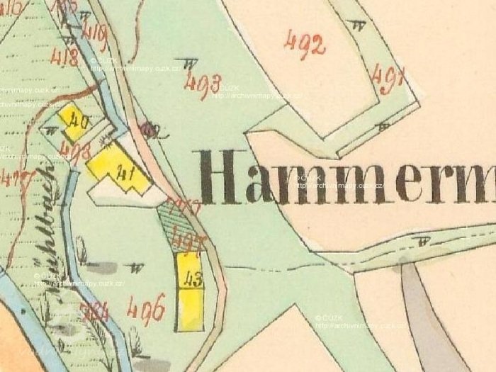 Hammermühle se připomíná již od 20. let 17. stol. O jeho starší historii ani novější, není nic bližšího známo. Neexistují ani žádné známé dochované fotografie. Mlýn zanikl po odsunu německého obyvatelstva. Jeho základy byly později využity pro stavbu rekreačního objektu - chaty.