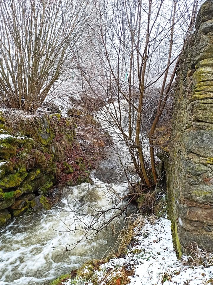 1) mlýnice 2) stodola 3) dva mostky přes bývalý náhon 4) bývalý náhon