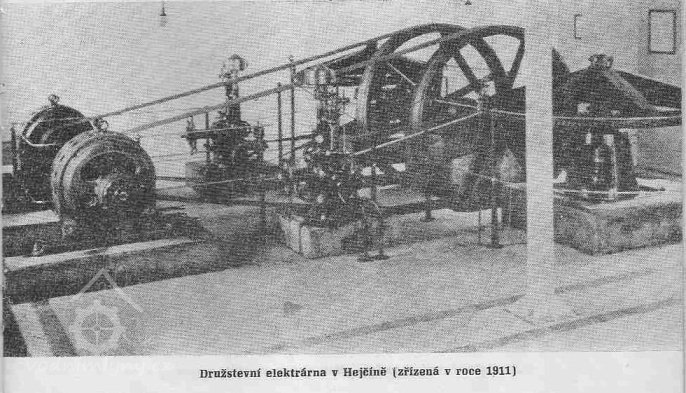 František Zřídkaveselý ve své knize:,,Počátky elektrifikace Moravy 1878-1919“ str. 50, 108 a 109, píše o hejčínské elektrárně mimo jiné toto: ,,Dobrá prosperita dříve vybudovaných družstevních elektráren v Unčovicích a ve Věrovanech ovlivnila pozitivně snahu vybudovat podobnou elektrárnu v Hejčíně. Zřízení elektrárny se ujal Pozemkový ústav v Olomouci. Již v projektu se počítalo s účastí obcí Hejčín, Řepčín, Černovír, Lazce, Klášterní Hradisko a Chválkovice. Ze zástupců těchto obcí byl 29. listopadu 1910 zvolen přípravný výbor. Začátkem ledna 1911 proběhly schůze v obcích a 29. ledna 1911 bylo ustaveno společenstvo, které bylo 4. února zapsáno do rejstříku. Jako znalci byli k této akci přizváni profesoři brněnské české techniky inž. V. List a inž. L Grimm. Po formálních přípravách bylo pak dne 15. března 1911 přistoupeno k definitivnímu zakoupení hejčínského mlýna. Společenstvo za něj zaplatilo 90 000K. Poté byly zahájeny intenzívní práce na výstavbě elektrárny. Stavba centrály byla zadána firmě Bartelmus, Donát a spol. v Brně, stavba sítě firmě V. Adler a A. Srba, která zatajila svou tíživou finanční situaci a v průběhu prací se dostala do konkurzu, takže i stavbu sítí převzala firma Bartelmus, Donát. Na jaře 1912 byly veškeré práce dokončeny. Jako výše uvedené elektrárny, které byly elektrárně v Hejčíně vzorem, také hejčínská družstevní elektrárna dobře prosperovala. K valné hromadě, konané 27.dubna 1912 tvořil její čistý zisk přes 12 720 K a byl převeden na rezervní fondy. Podobně tomu bylo i v následujících létech. Koncem roku 1914 měla již splaceno celkem 1462 podílů po 50K t.j. 73 100 K Celková situace elektrárny je patrná z bilančního vyúčtování závodu k 31. prosinci 1914. Celková bilanční hodnota činila 349 277 K. Hrubý zisk činil 37 832,67 K. Na amortizaci strojů, budov atd. bylo věnováno 8632 K, úroky z výpůjček činily 16 280 K. Po odečtení daní a správních výloh zůstal čistý zisk 615,97 K. Rezervní fond obnášel k uvedenému datu 14 577 K a speciální rezervní fond 8295,84 K. Rovnováhu v bilanci zajišťoval v dřívějších letech značný příjem za instalace. V roce 1912 činil např.18 516,38 K a v roce 1915 už pouze 10 450 K. Za to však vzrůstala položka za odebraný proud. V roce 1912 (od 1.dubna do 31.prosince) činila tržba za proud 11 345,21 K, v roce 1914 už 26 103,57 K. Tu sehrálo svou úlohu také poznenáhlé připojování okolních obcí. Přesnou dobu připojení jednotlivých obcí zatím neznáme. Víme jen, že k pěti uvedeným v druhé kapitole, přibyly k roku 1918 obce Hradisko a Křelov, které byly převzaty od elektrárny v Horce a Topolanech. Hejčínská elektrárna byla později propojena s elektrárnou Moravských oceláren akc.spol. v Řepčíně ke vzájemné spolupráci. V roce 1918 vyrobila 183 000 kWh a prodala uvedeným obcím 216 400 kWh, což znamená, že 133 400 kWh odebrala od závodní elektrárny v Řepčíně“.