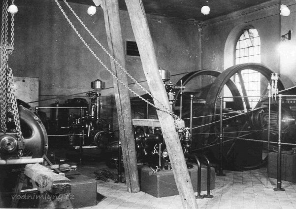Popis1930: 2 turbíny Francis, hltnost 5 m3/s, spád 1,35 m, výkon 140 HP