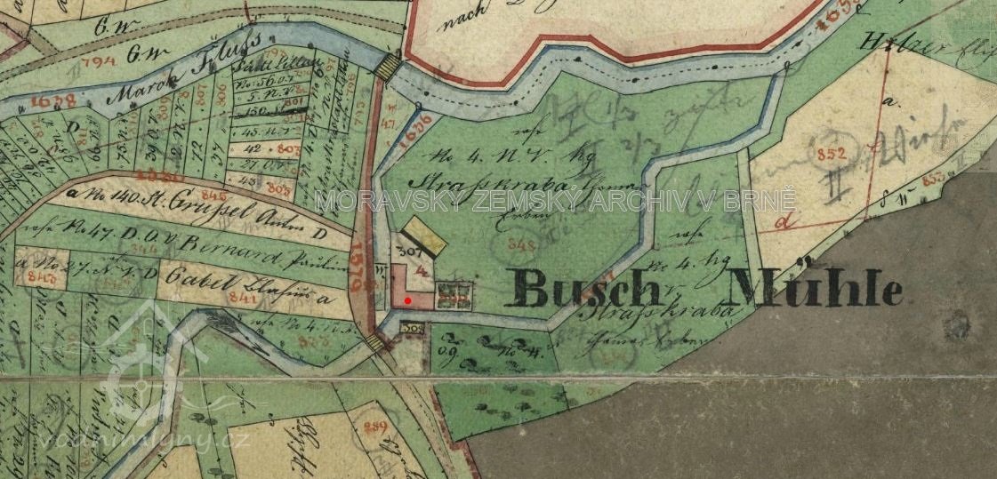 Místní část Litovle zvanou Pavlínka uzavírá historický mlýn Pošmýl (z německého Busch = křoví).
