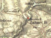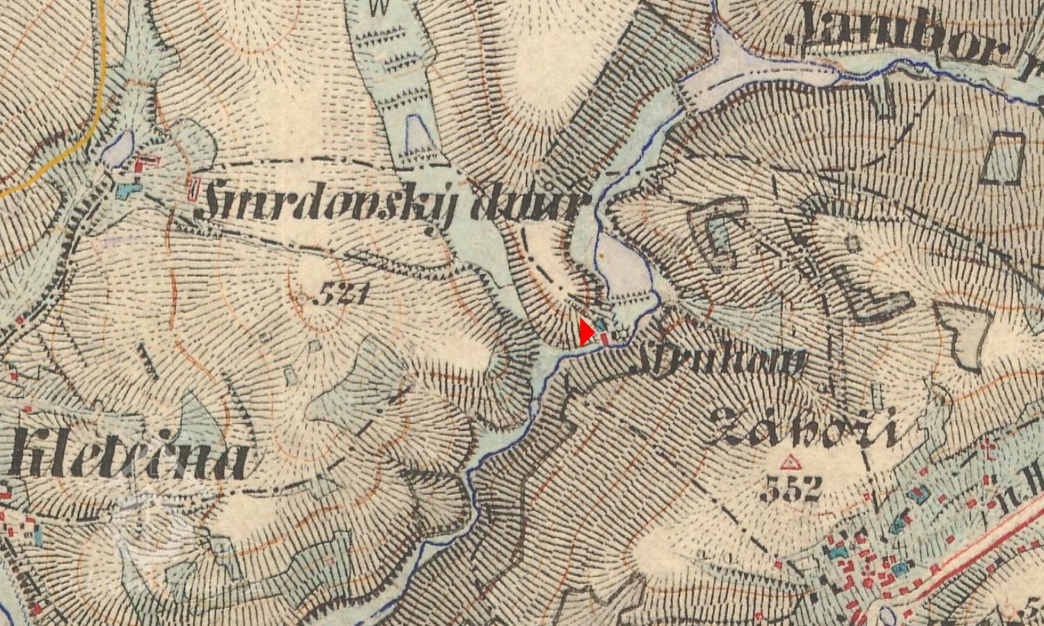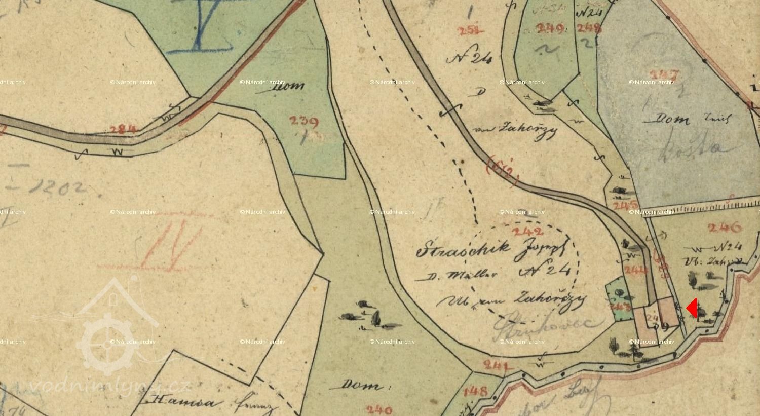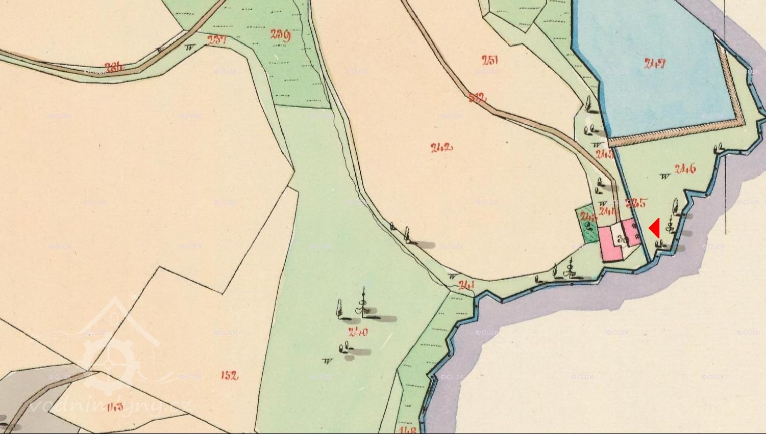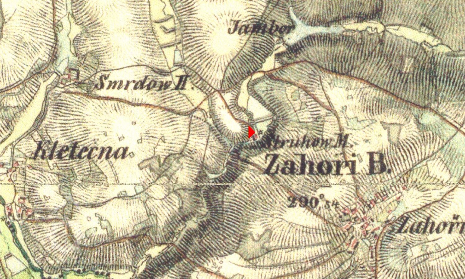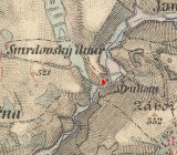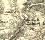 Fixní bod stanoven na rohu mlýna proti rybníku na způsobu P.Ž. trojúhelník na špičku 1891