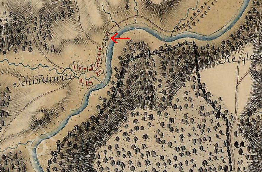 Dále po proudu řeky se nacházel Žimrovický mlýn, zvaný též podle svých pozdějších majitelů Schulzuv mlýn. První zmínka o mlýnu v Žimrovicích pochází z urbáře hradeckého panství, který nechal roku 1574 sepsat Frydrych ml. Cetrys z Kynšperka, který držel tehdy hradecké panství v zástavě. Mlýn tehdy patřil žimrovickému fojtovi Matouši Vrtalovi. Ze mlýna, který zbudoval zástavní pán odváděl 16 čtvrtní a byl povinen krmit dva panské vepře. Při mlýnu byla panská louka. Rovněž zahrada byla mlynáři přidána.