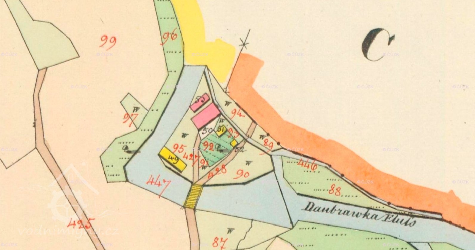 Popis1930: 3 kola na svrchní vodu, hltnost 0,23 m3/s, spád 3,6 m, výkon 10 HP