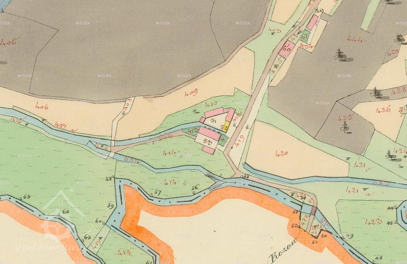 Popis1930: 5 kol na svrchní vodu, hltnost 0,4 m3/s, spád 3,7 m, výkon 12,5 HP