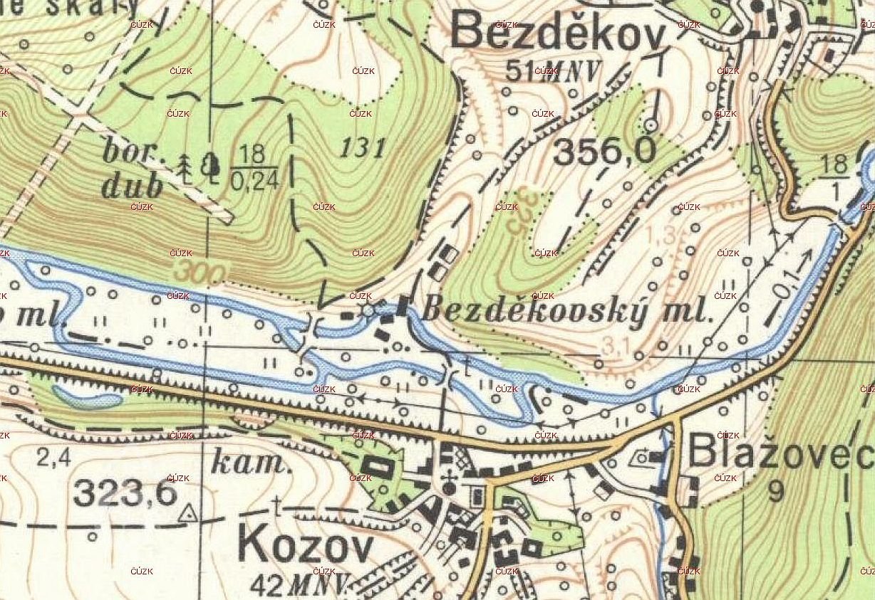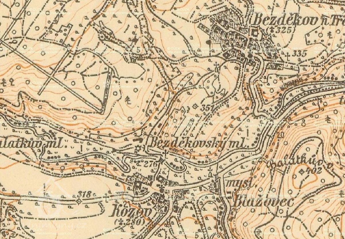 Mlýn v Bezděkově je připomínán už v roce 1396. Byl postaven pod vesnicí na mlýnském náhonu u řeky Třebůvky. V roce 1398 začal patřit Bezděkov i s mlýnem k Bouzovu.
