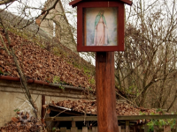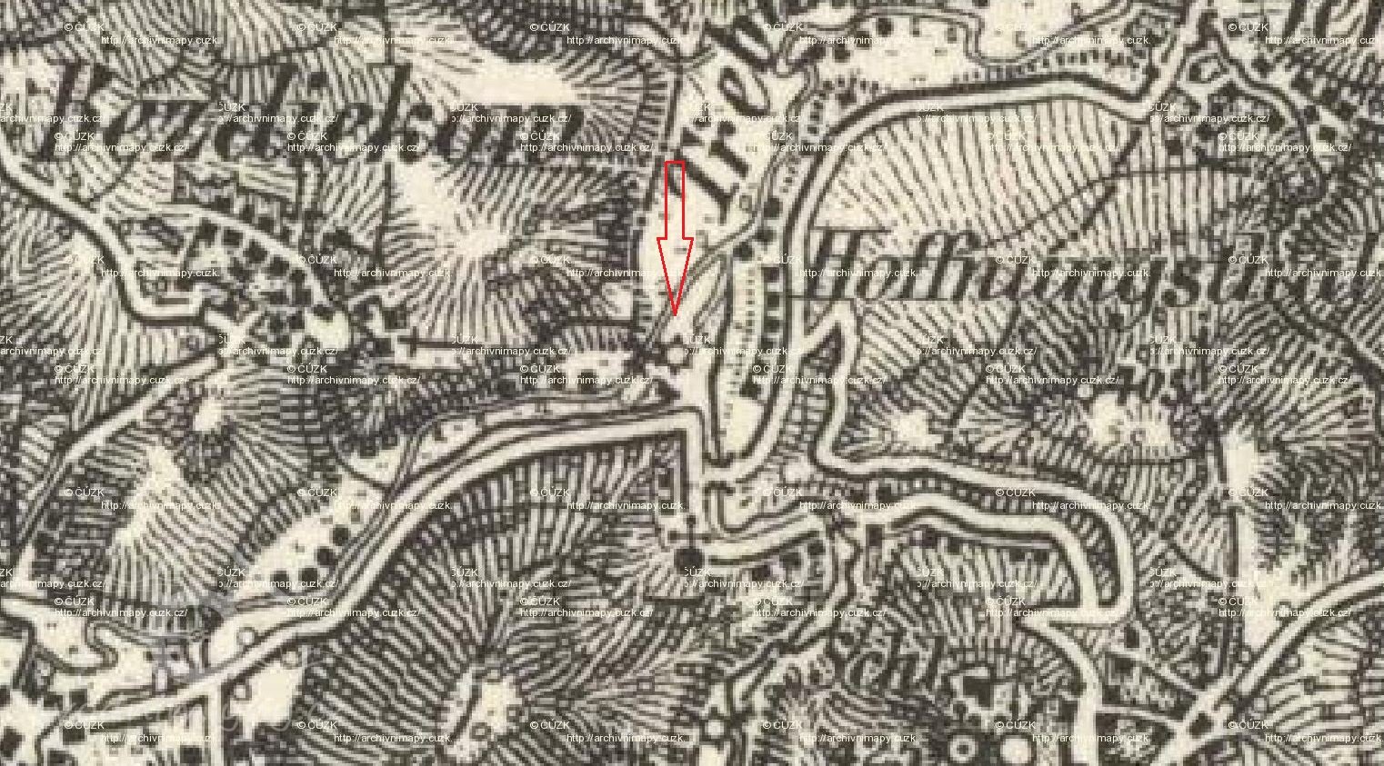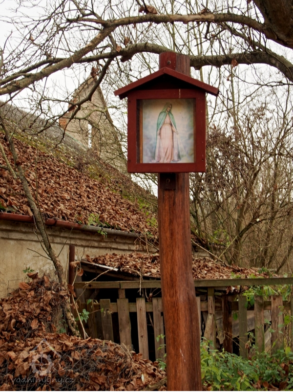 U silnice nad ním stojí starý kamenný kříž s nápisem: „Ján Balatka mlynář na Dolách tuto památku zanechal 1809“.
