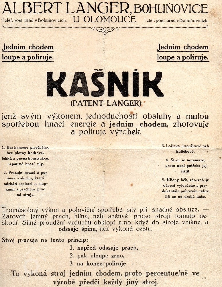 Na mlýně v Bohuňovicích od roku 1901 hospodařila rodina Langerů. Než se rodina přestěhovala do Bohuňovic, žili do roku 1891 ve Šternberku, poté se přestěhovali do Liboše u Štěpánova, kde začali provozovat mlynářskou živnost.